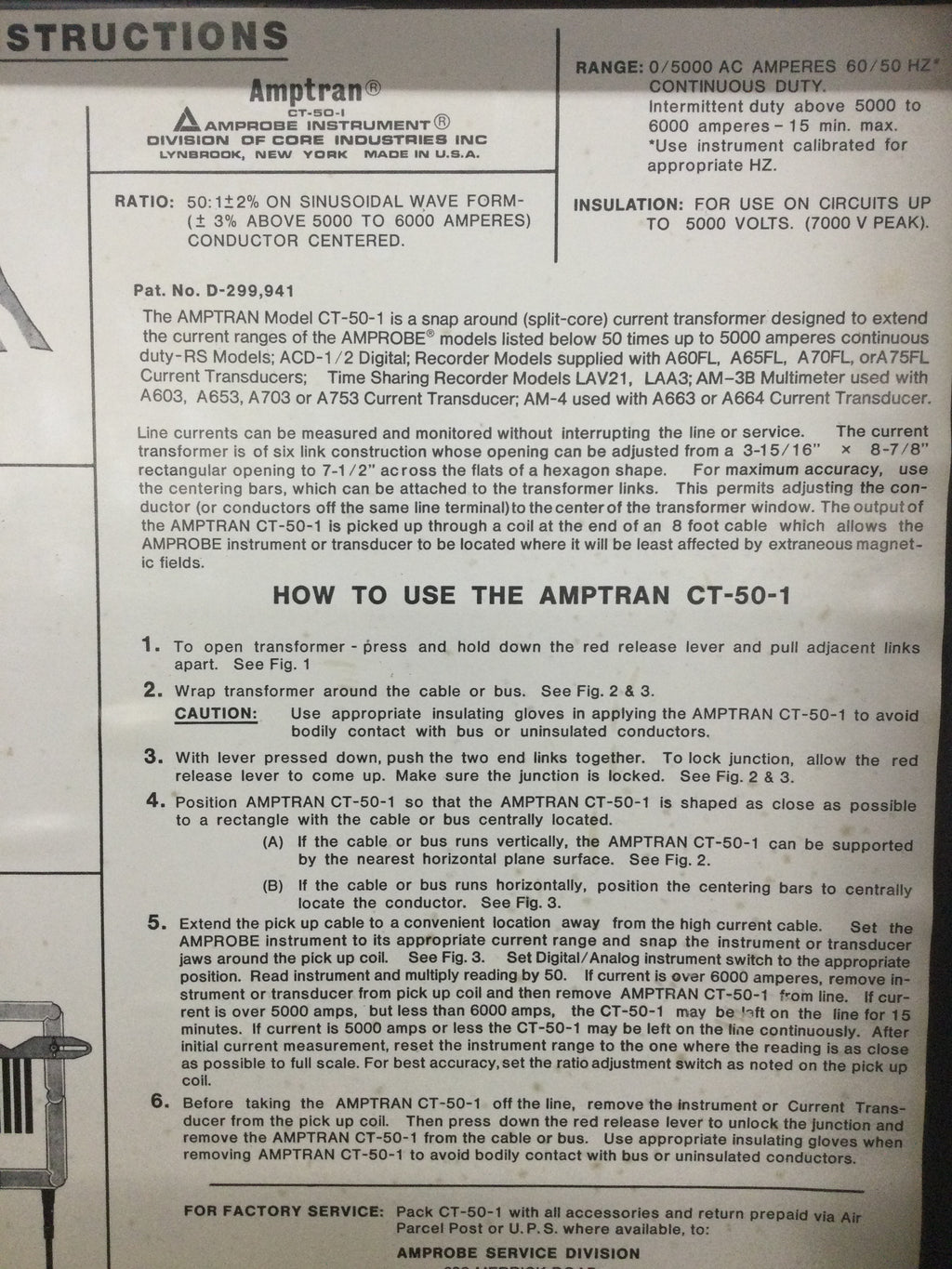 Amprobe Amptran CT-50-1 High Current Transformer in Carrying Case Range 0/5000 AC Amperes 60/50 Hz