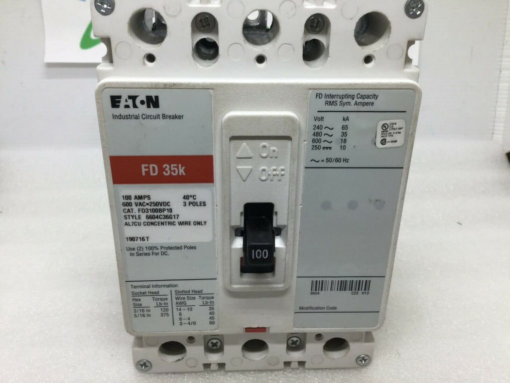 Cutler Hammer FD3100BP10 100 Amp 600v 3 Pole 35k Circuit Breaker