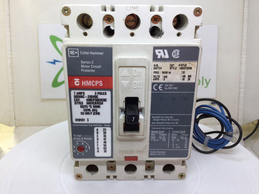 Cutler-Hammer HMCPS007C0C 7 Amp 3 Pole 600V Circuit Breaker w/Aux Switch