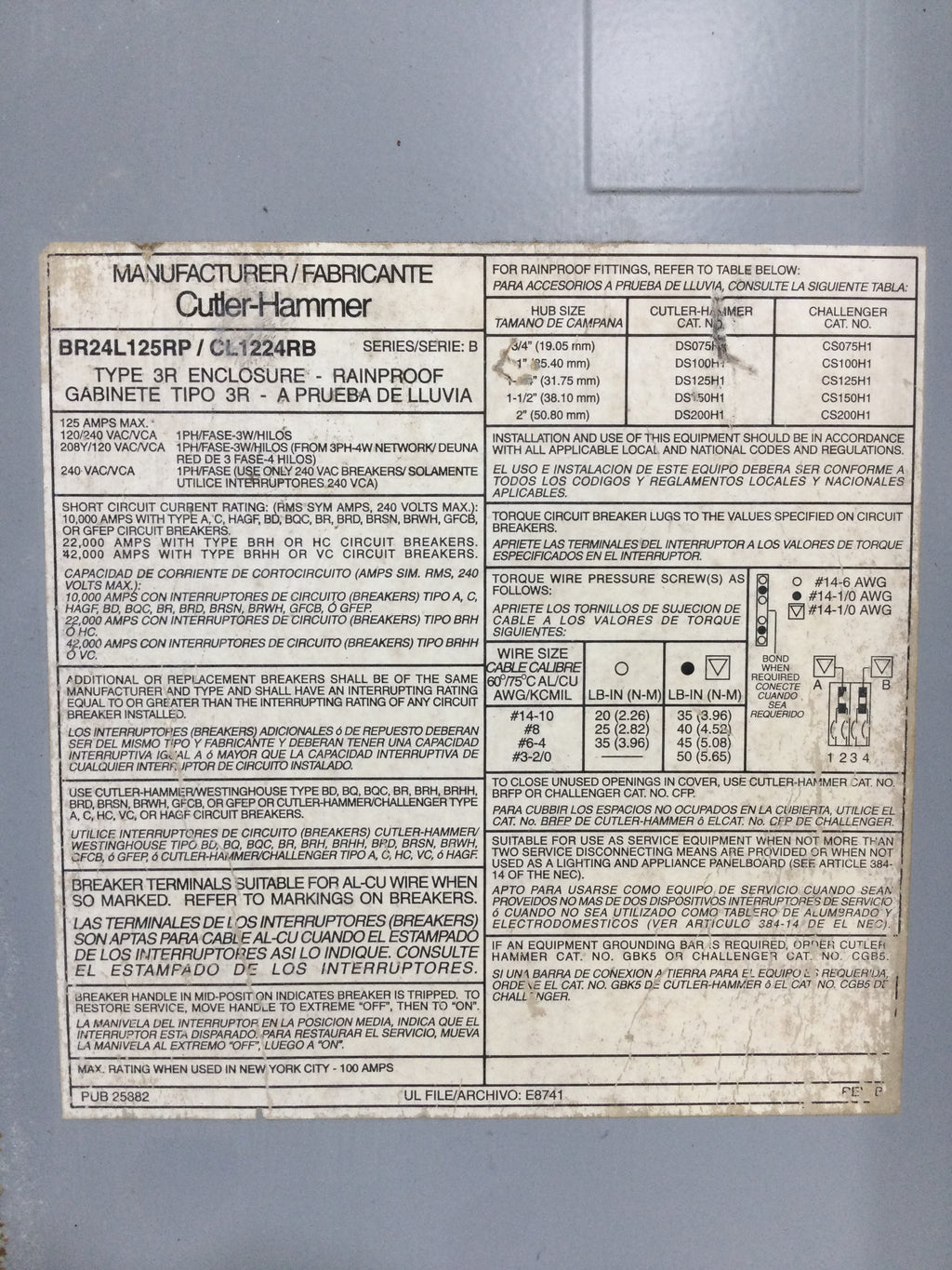 Cutler-Hammer BR24L125RP 125 Amp 2 Space 120/240V Panel Cover 11 5/8" x 6 1/2"