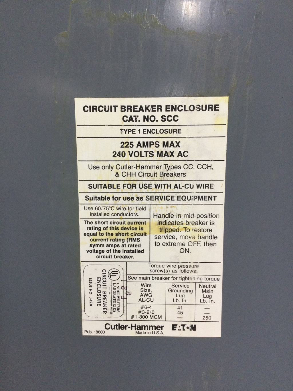 Cutler-Hammer SCC 225A 240VAC Type(s) CC, CCH & CHH Nema1 Circuit Breaker Enclosure