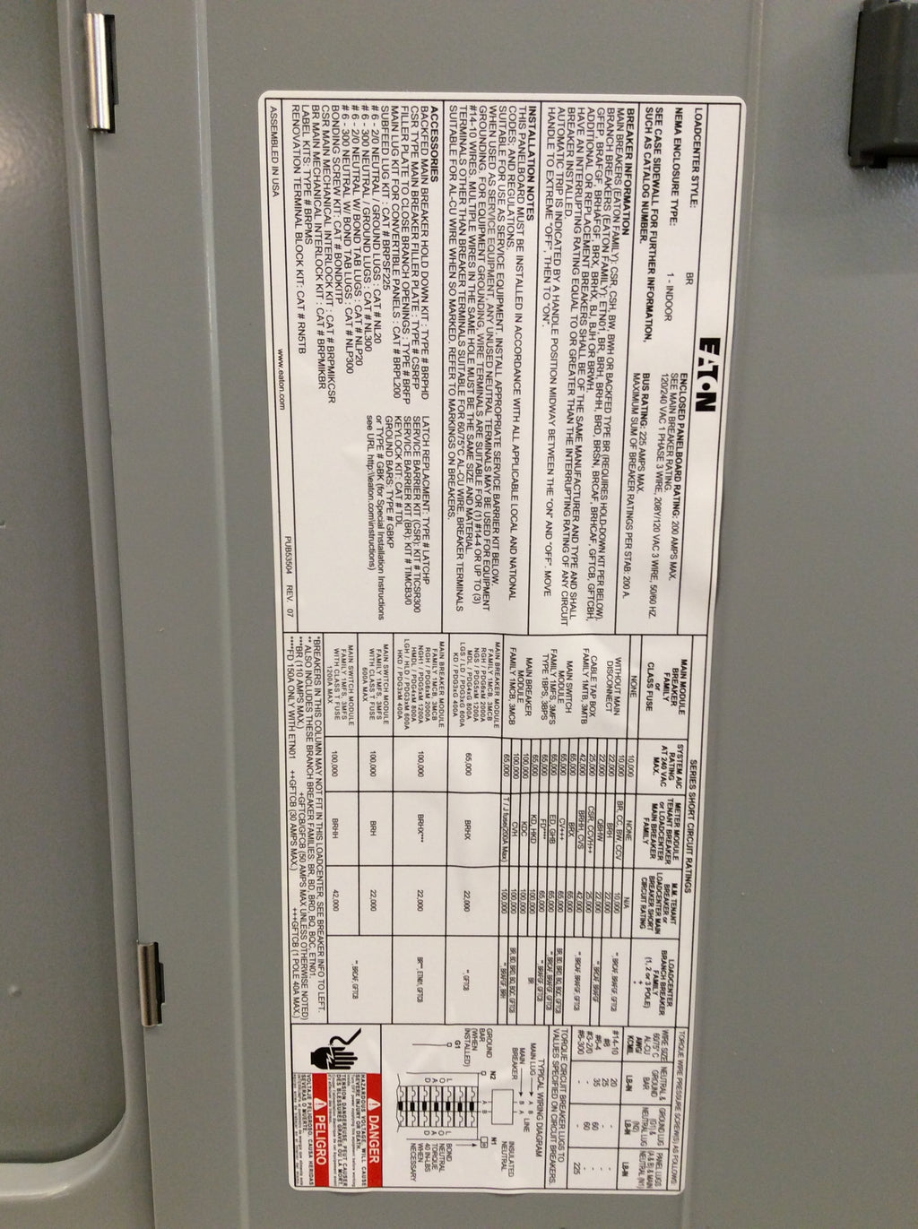 Eaton BRP30NC200 Type BR/BRP 200A 30 Circuit 120/240VAC Convertible MLO/MB CU Bus