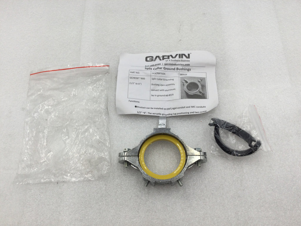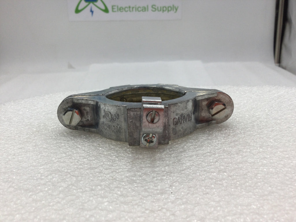 Garvin GCHK200 split collar ground bushings provide secure grounding connections for electrical conduit systems. These bushings feature a split collar design for easy installation without disassembly.