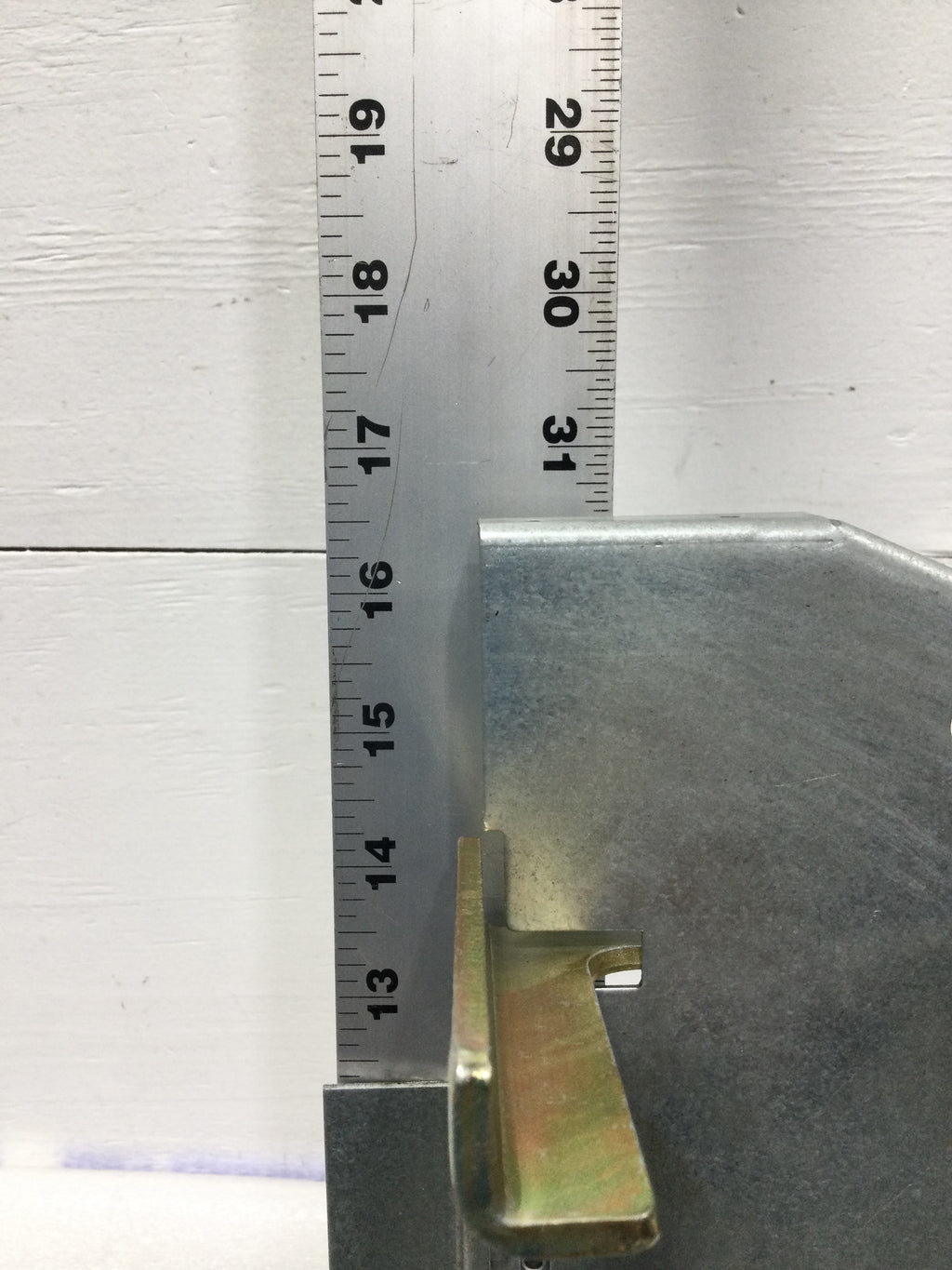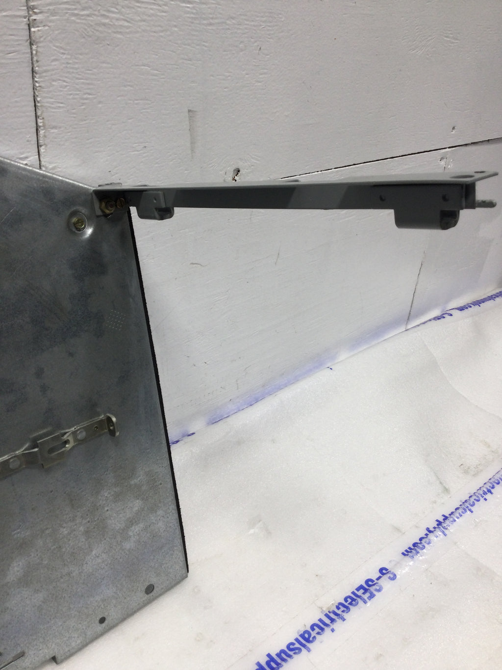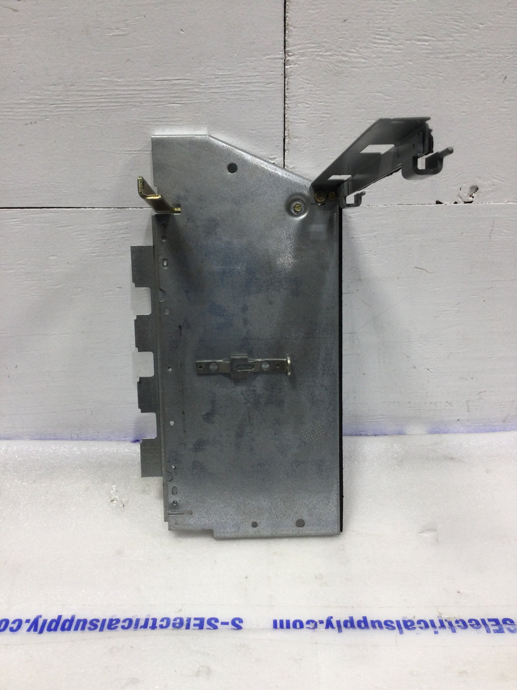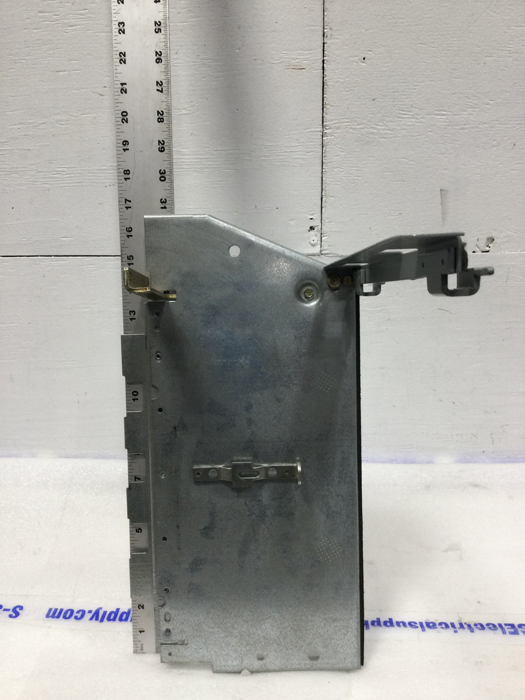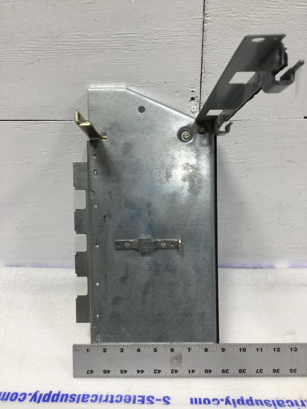 GE 0821X0405L01 bucket shelf designed specifically for 8000-Line MC equipment. This 16 1/2" x 8 1/2" shelf features an integrated door hinge mechanism for secure mounting and easy access. Built to OEM specifications, it ensures reliable performance and proper fit within your electrical distribution system. Ideal for organized storage and component accessibility in industrial applications.