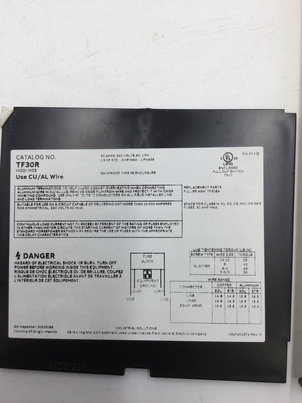 The GE TF30R is a 30 Amp, 240V, single-phase dead front electrical component designed for reliable power distribution. Its dead front design enhances safety by preventing accidental contact with live parts, making it suitable for residential and commercial electrical installations requiring secure, efficient current handling.