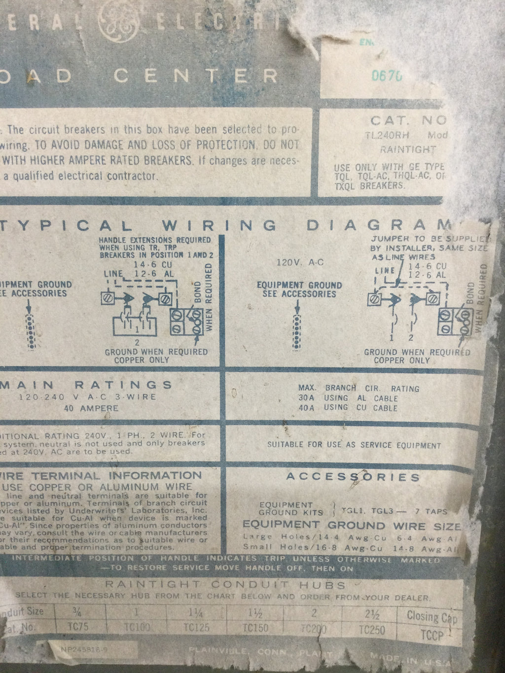 General Electric TL240RH Nema 3R Cover Only 40 Amp 120/240V
