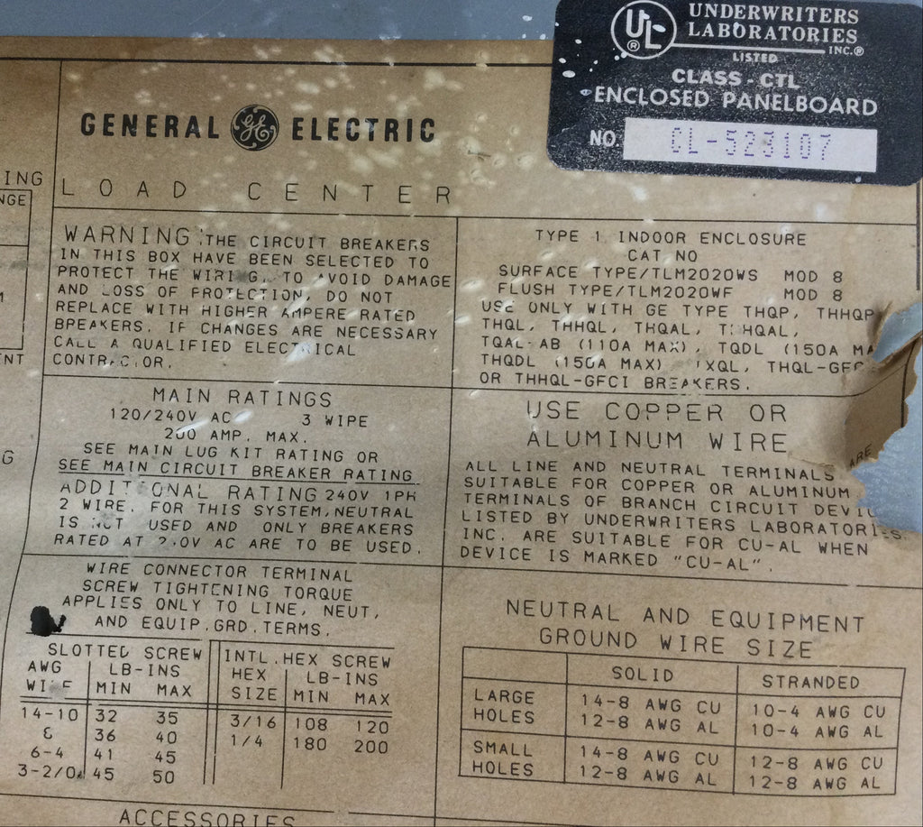 GE TLM2020WS 200 Amp main lug panel with 40 spaces accommodates three-phase 240V distribution. Type 1 enclosure rated for indoor use provides reliable circuit protection and load management for residential or light commercial applications. Dimensions 30 1/2" x 14 3/8" fit standard wall installations.