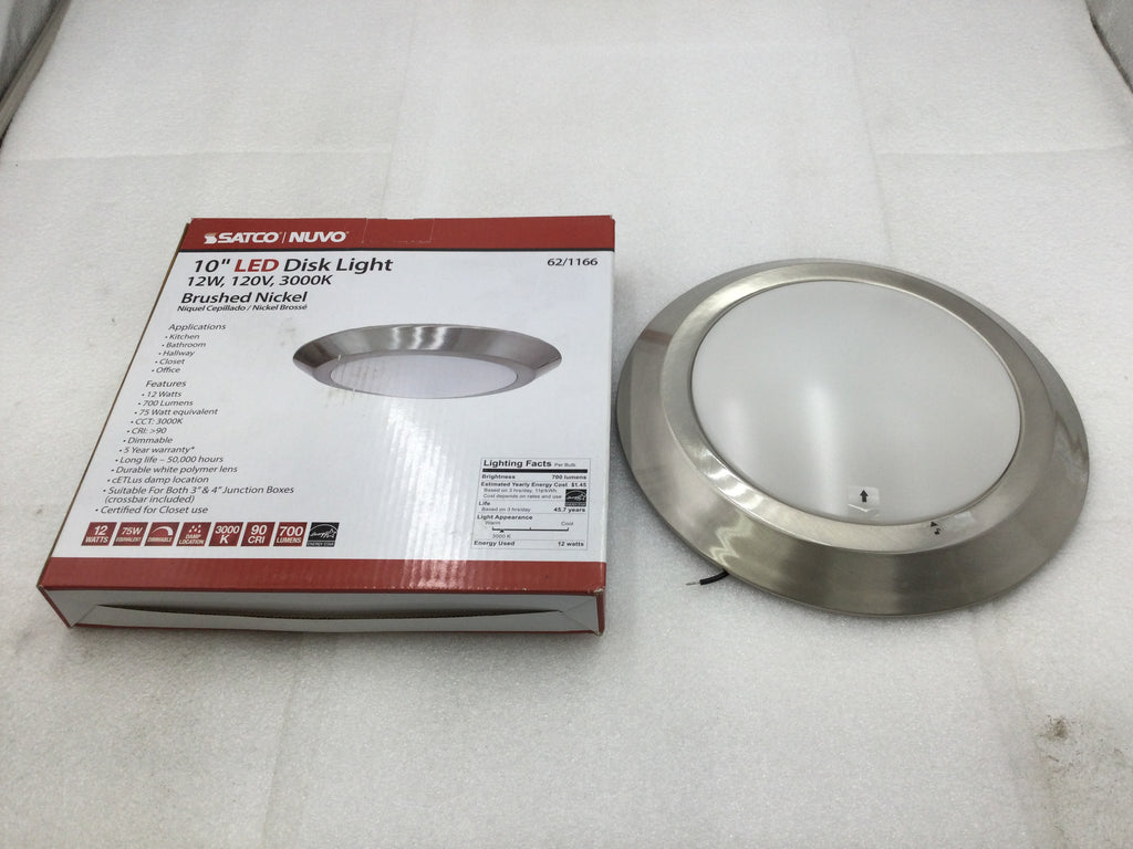 Upgrade your lighting with the Satco/Nuvo 62/1166 LED Disc Light. This 10" light provides 12 watts, 120 VAC, and 700 lumens, making it energy efficient and bright. With a 3000K color temperature and brushed nickel finish, it adds a modern touch to any space.