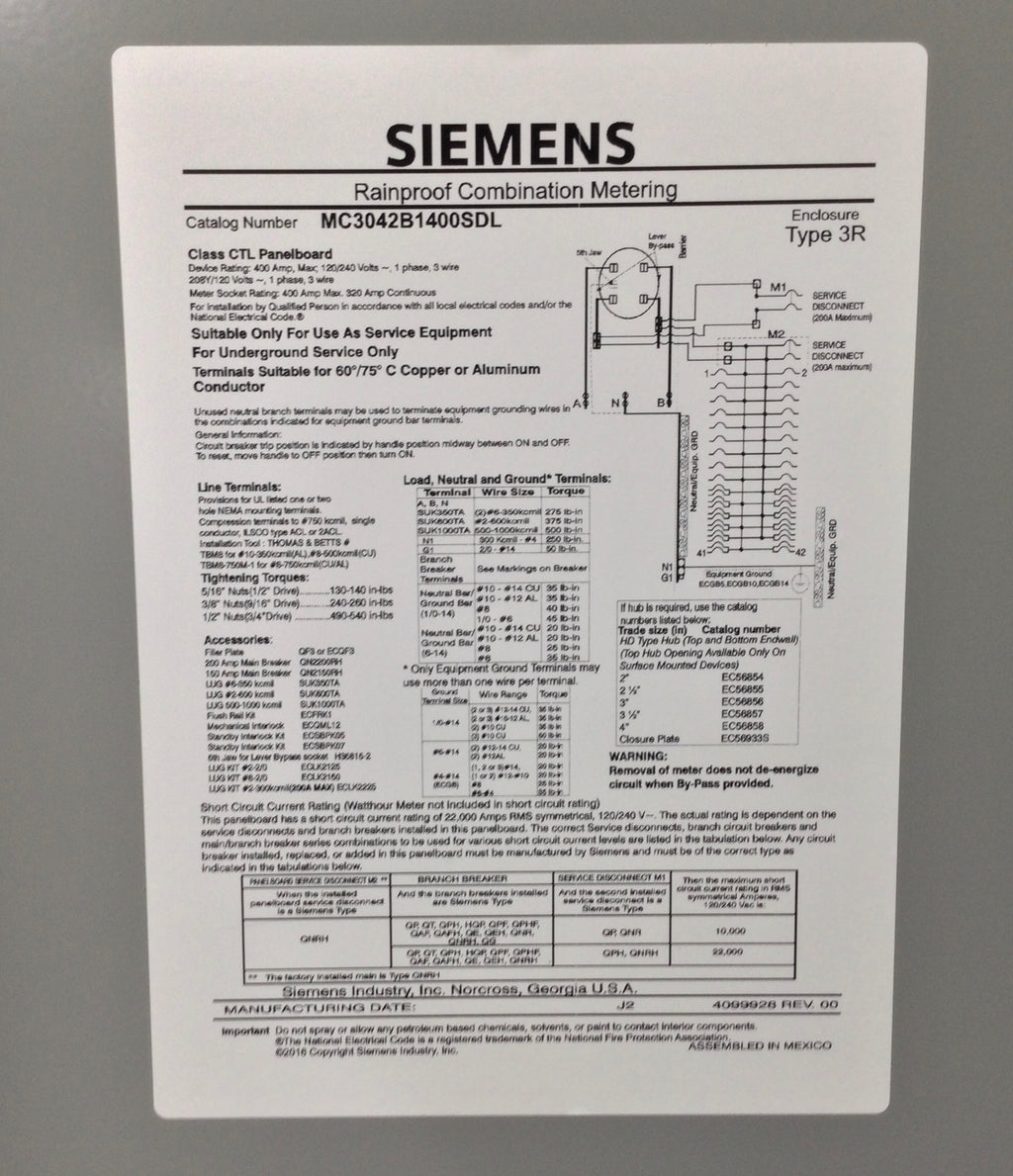Siemens MC3042B1400SDL 400 Amp 1-Phase 240V Panelboard