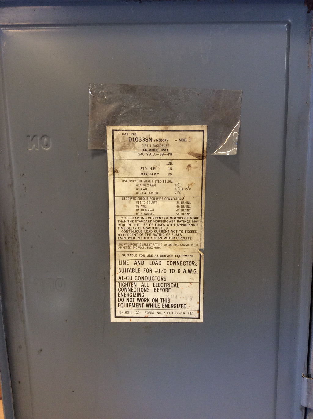 Sylvania D1033SN Type 1 Enclosure 100A Max 240VAC 3 Phase 4 Wire Std Hp 15 Max Hp 30