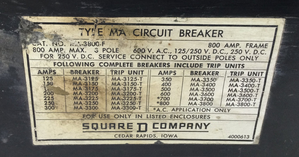 Square D MA-3800F 800 Amp 3 Pole 600V Circuit Breaker w/600 Amp Trip