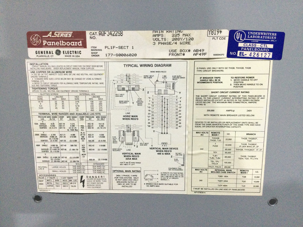 GE General Electric AQF3422SB 225 Amp 208Y/120 3 Phase 4 Wire 42 Space Panelboard 49" x 20"
