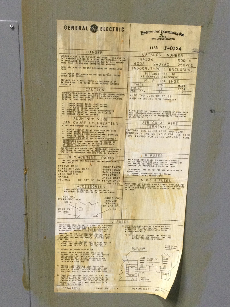 The General Electric TH4326 is a 3 phase 3 pole 240 Volt 600 Amp TH type Fused Disconnect Switch. This switch has a Nema rating of 1 and an AIC rating of 200kA@240V. The TH4326 is a single switch configuration and uses class