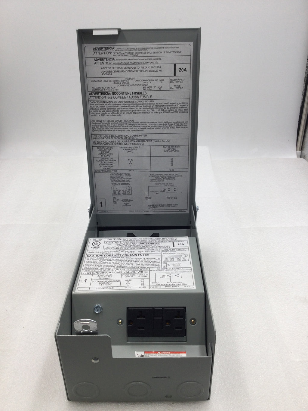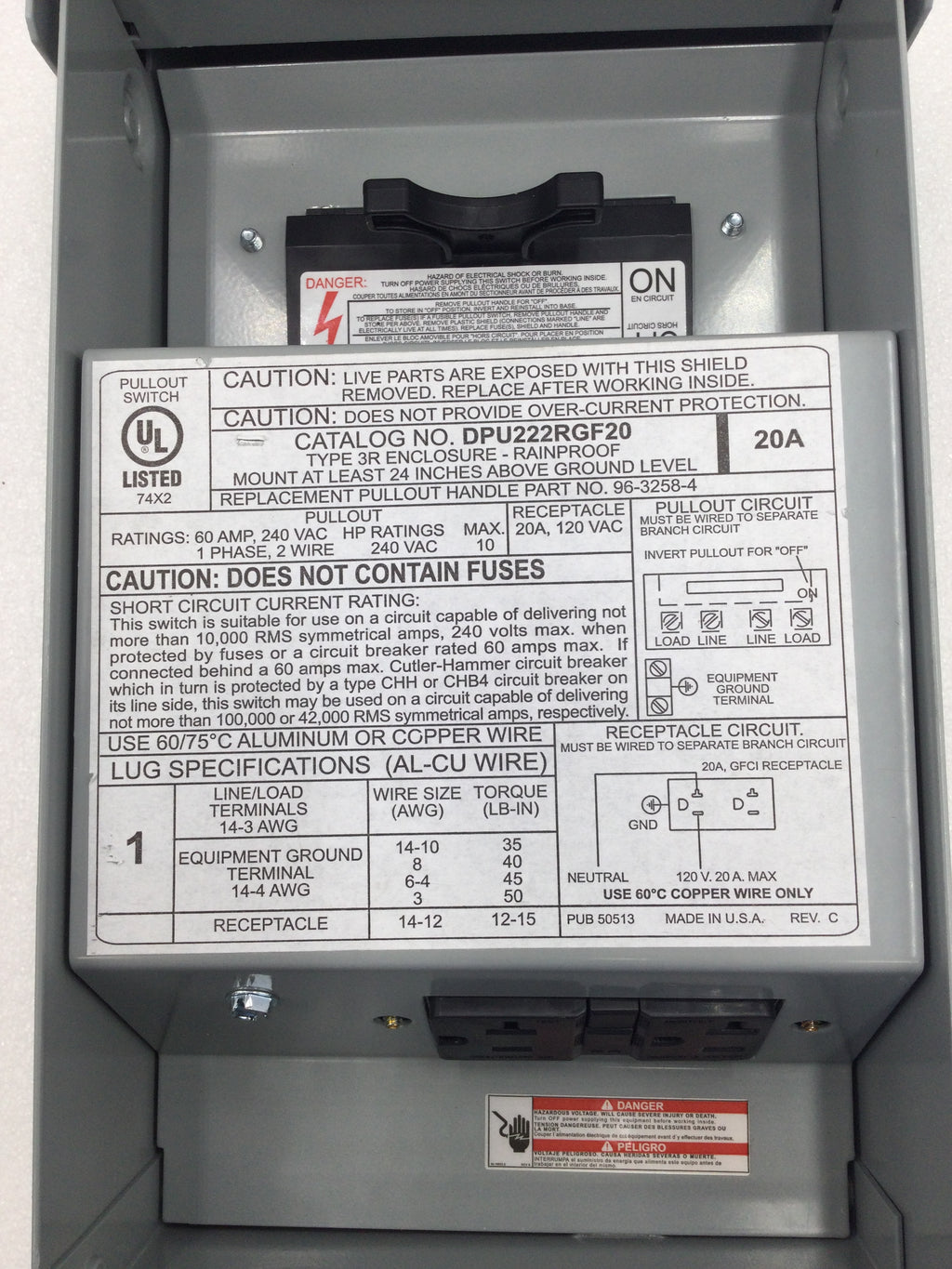 Eaton DPU222RGF20ST 60 Amp 120/240 VAC Non-Fused Outdoor Pullout A/C Disconnect with 20 Amp GFI Receptacle