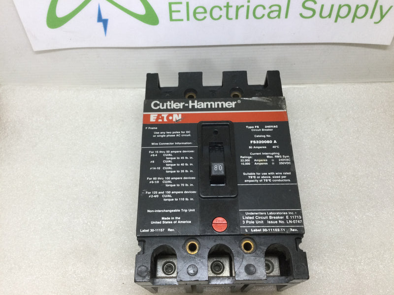 CUTLER HAMMER FS320080A 3P 80A 240V Circuit Breaker 3 Pole 80 Amp