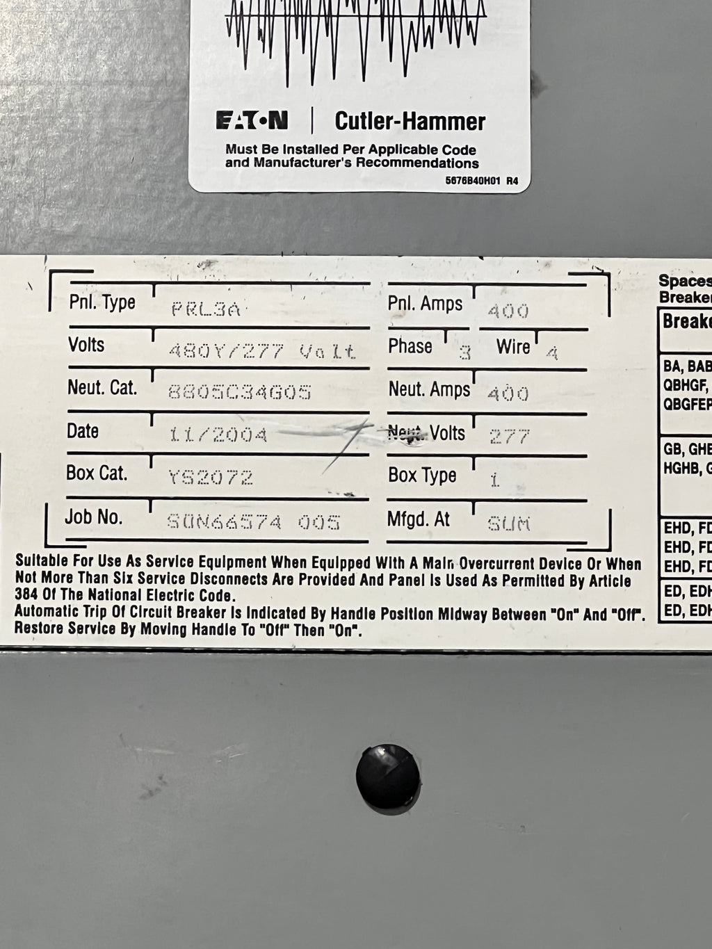 Cutler Hammer Panel Board PRL3A 400 Amp Cover/ Dead Front Only 14"x 64.5"