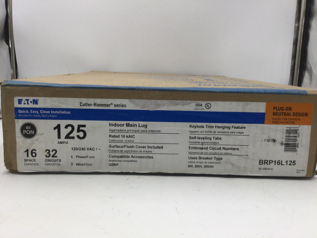 The Cutler Hammer BRP16L125 is a 125 Amp panel door designed for 16 spaces, compatible with 120/240V electrical panels. Measuring 19 3/4" by 15 3/8", it provides reliable protection and easy access for residential or commercial circuit management, ensuring safety and durability in your electrical setup.