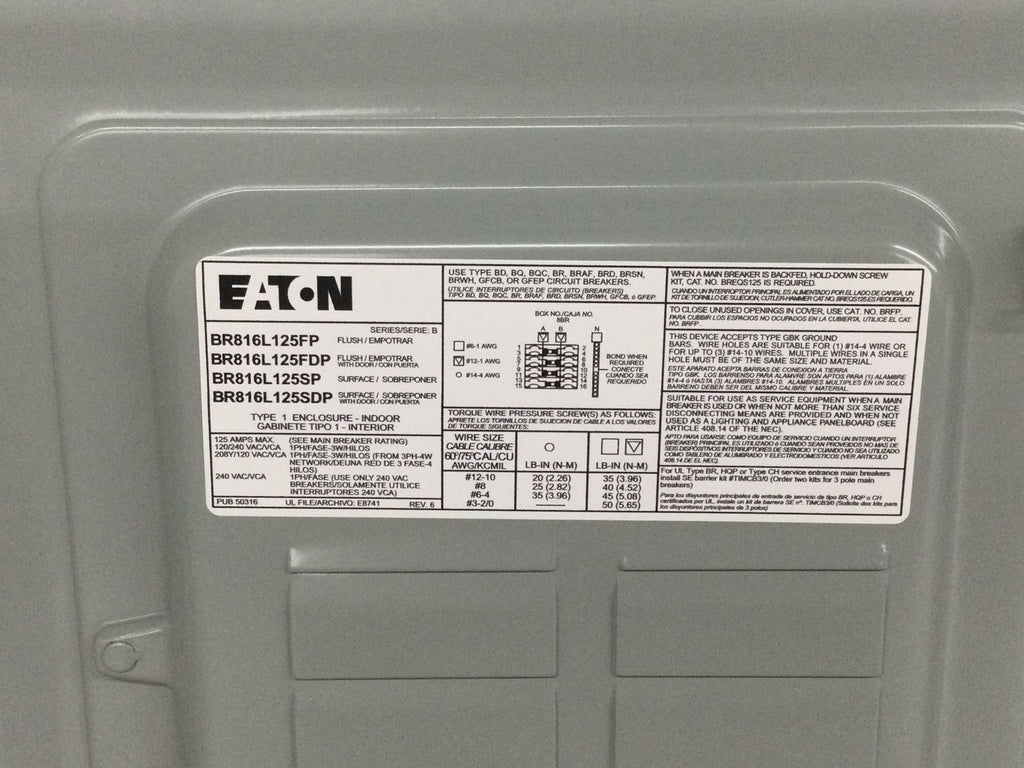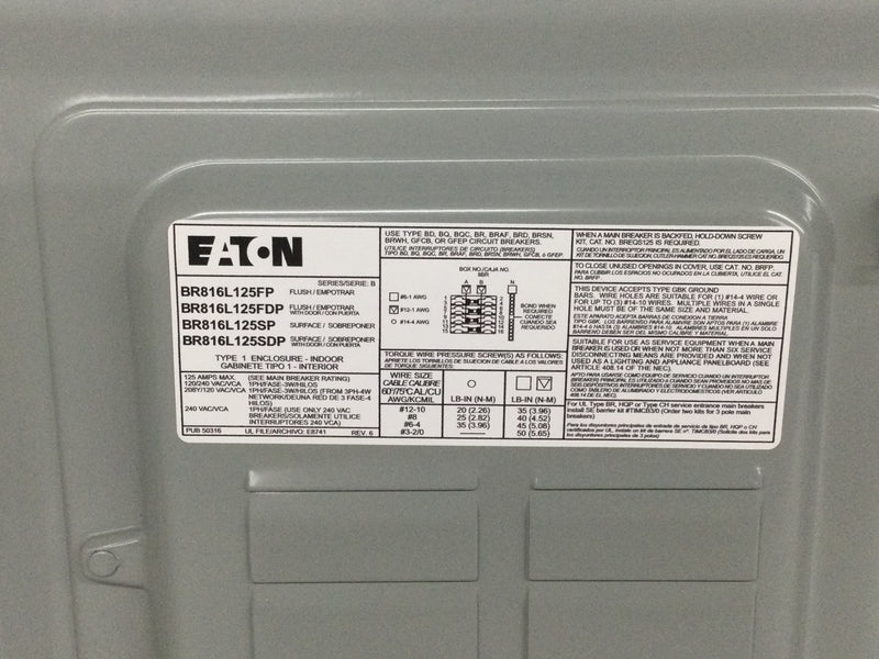 Eaton BR816L125FP 125A 120/240V 8 Space Flush Door 12 1/4" x 14 1/8" - Flaw