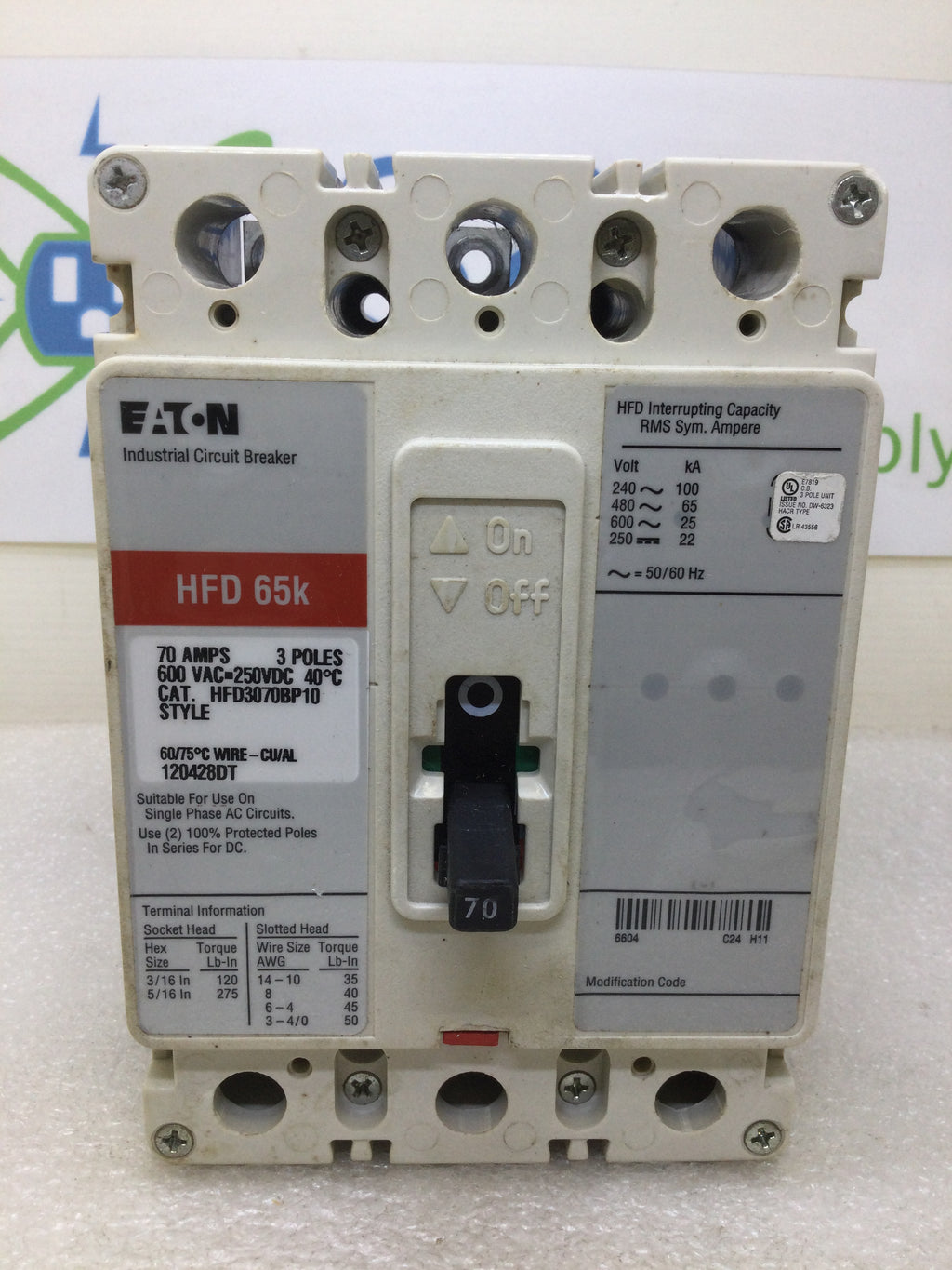 The Eaton HFD3070BP10 70 Amp 3 Pole 600Vac HFD 65K Circuit Breaker provides reliable protection for your electrical system. With a high 65K interrupting capacity, this circuit breaker is ideal for industrial and commercial applications. Its compact design and 70 amp capacity make it a practical choice for various setups.