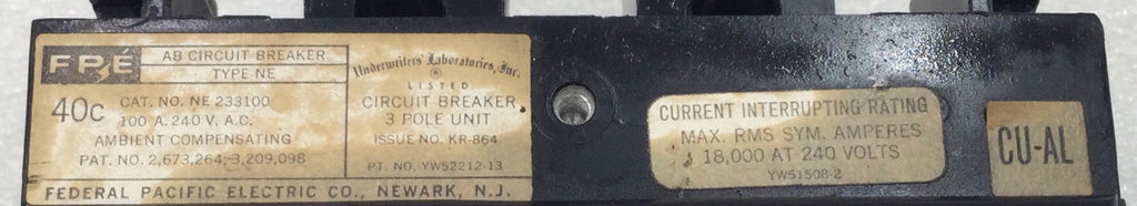 Federal Pacific NE233100 100 Amp 3 Pole 120/240V Type NE Circuit Breaker