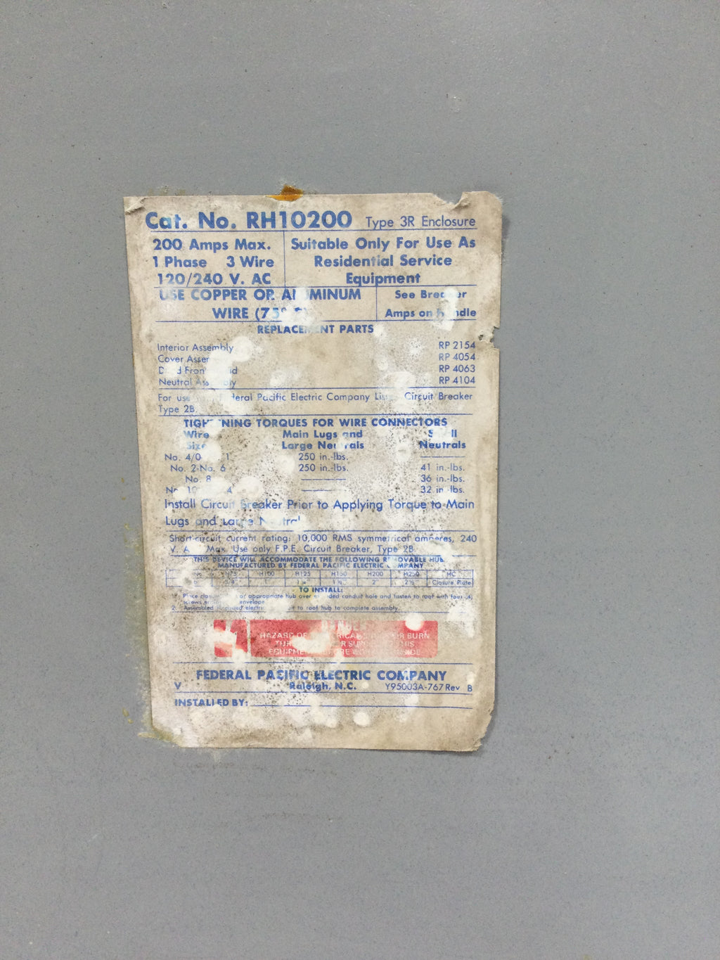 Federal Pacific RH10200 200 Amp 120/240V Cover Only w/Top Lip 16 3/4" x 13 3/4"