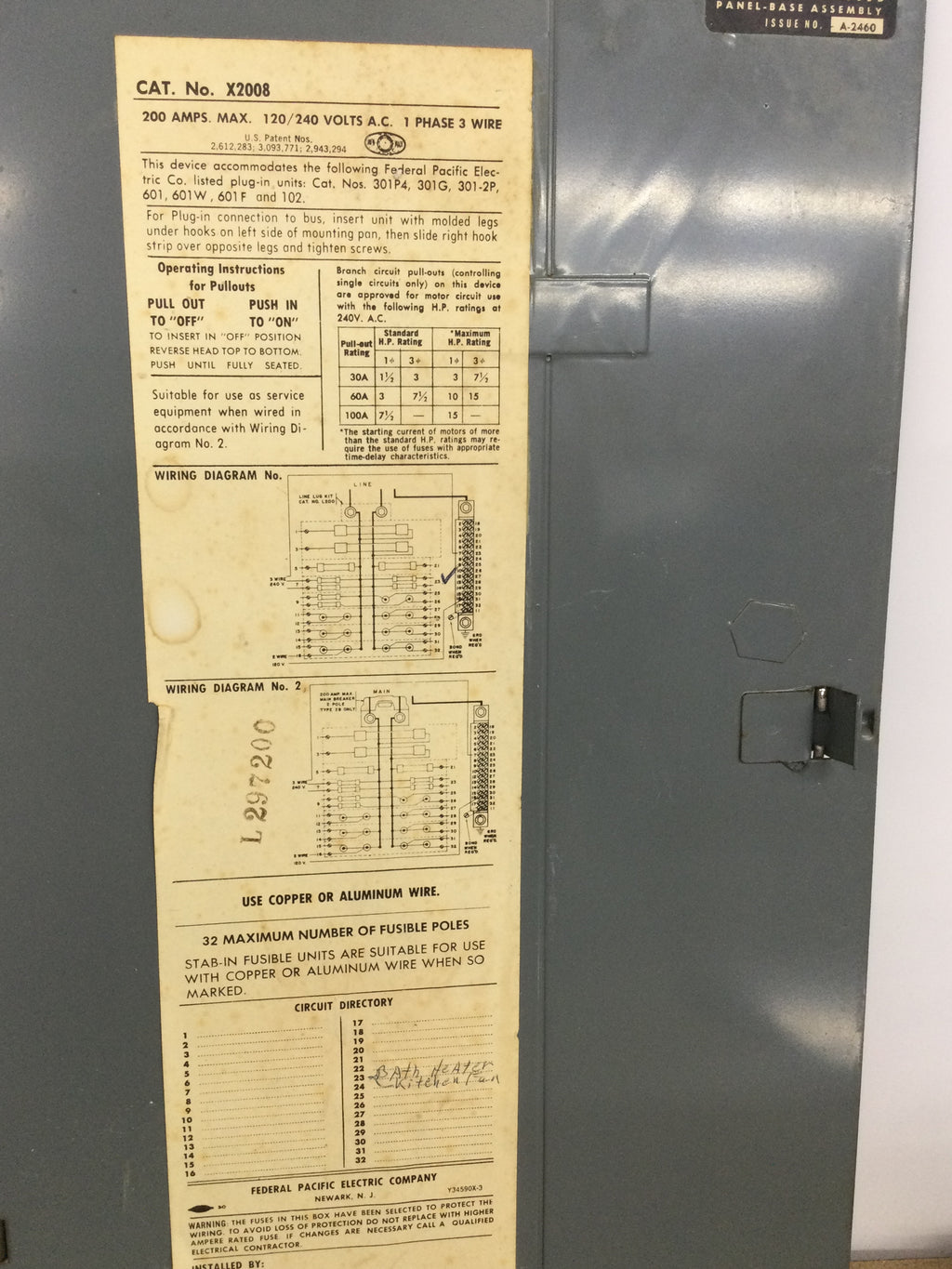 FPE X2008 200 Amp 32 Space 120/240V Cover/Door Only w/Main 24" x 13 5/8"