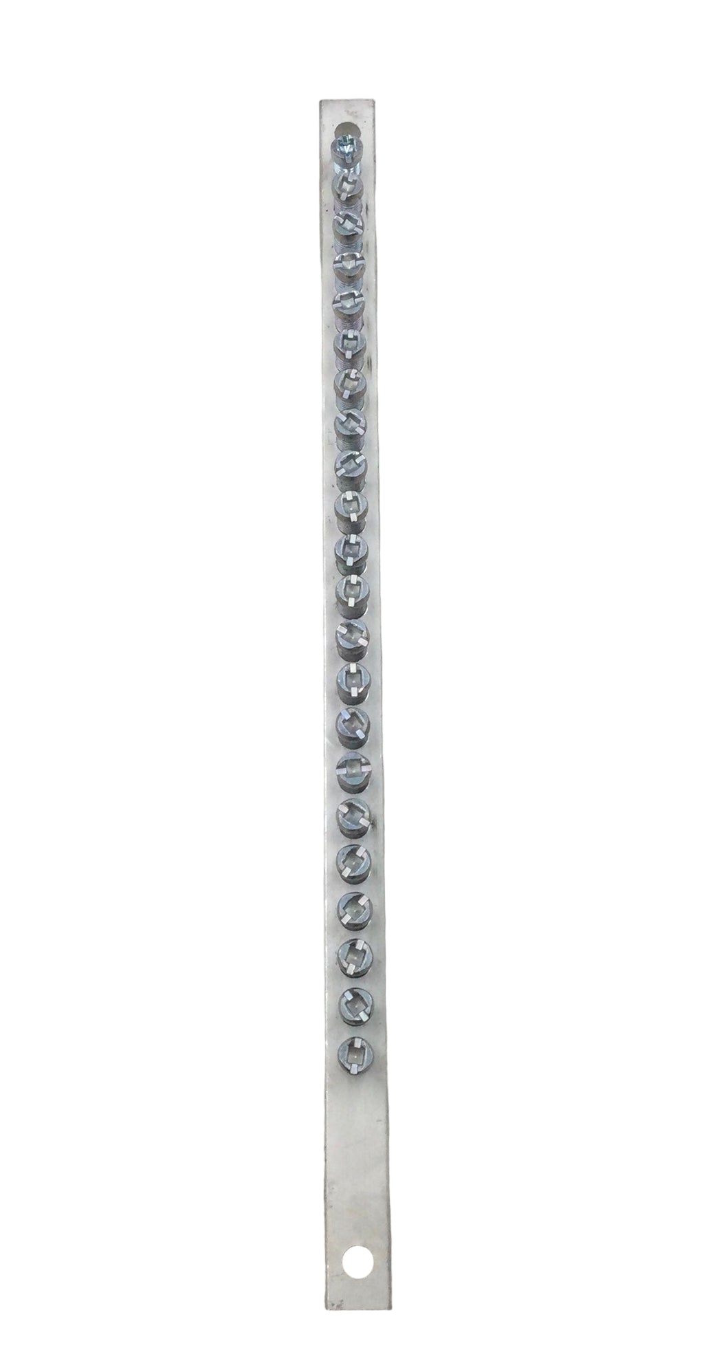 The General Electric TS4R815CSFLFMG grounding bar offers 24 positions for secure connections of 4-14 AWG wires in 120/240V systems. Designed for reliable grounding, it ensures safe electrical installations and compliance with industry standards. Ideal for residential or commercial panels requiring organized and efficient grounding solutions.