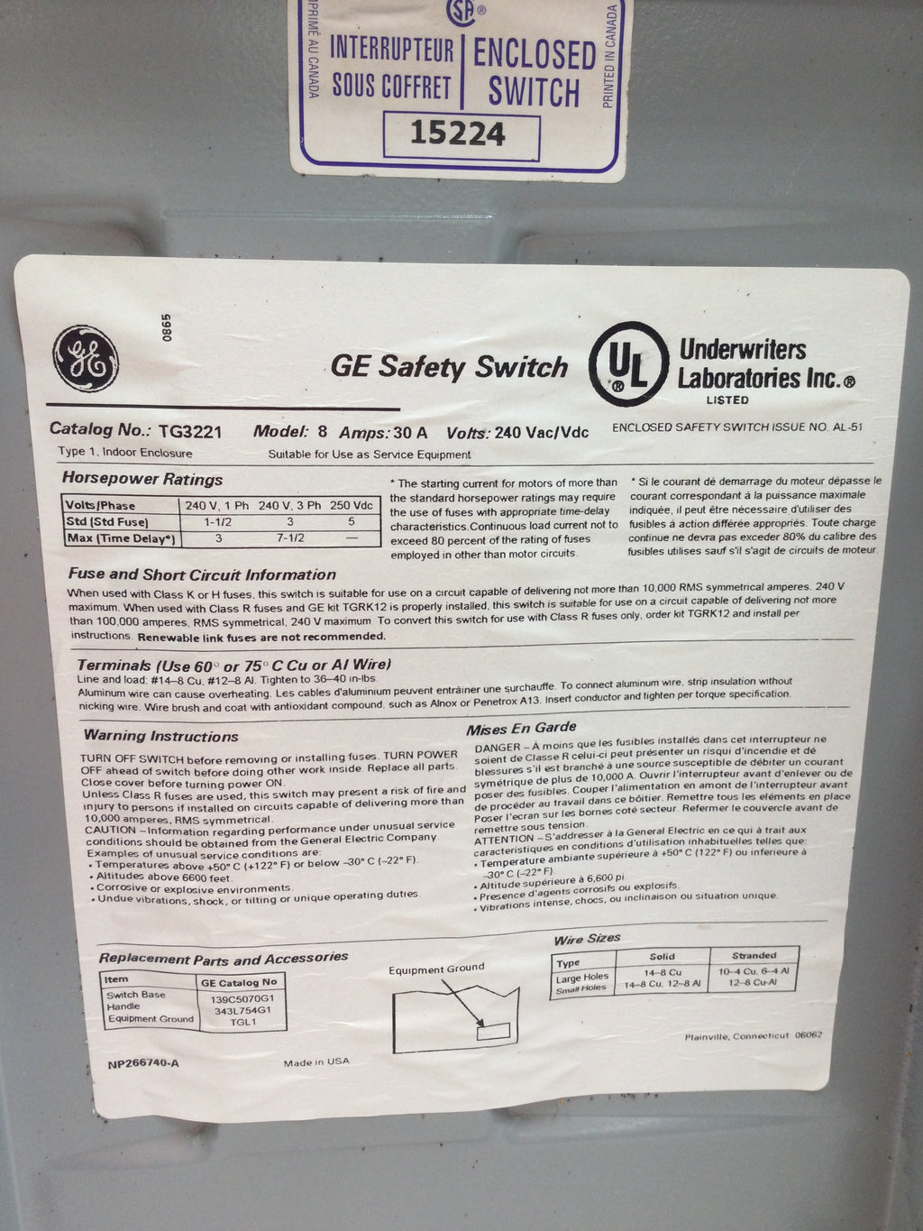 GE TG3221 30 Amp 2 Pole 3 Phase Model 8 240V General Safety Switch