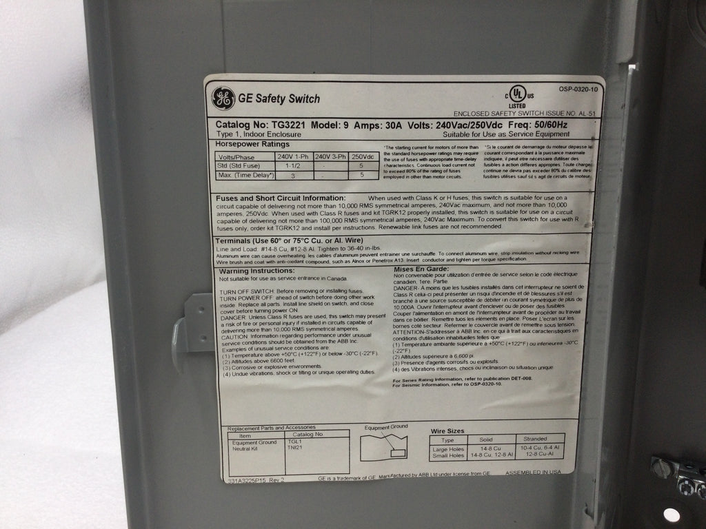GE TG3221 30 Amp 2 Pole 3 Phase Model 9 240V General Safety Switch