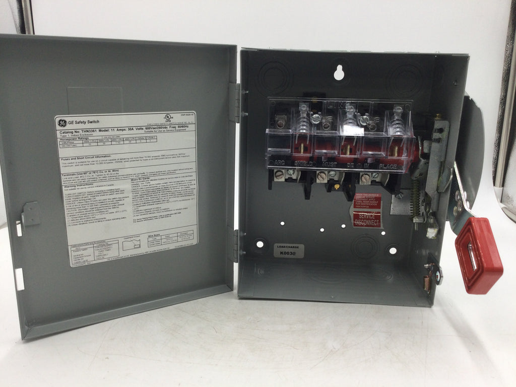 The General Electric THN3361 is a 30A, 3-pole non-fusible safety switch rated for 600V. Compact at 10 3/8" by 9", it provides reliable disconnection of power for maintenance or emergency situations, enhancing site safety without requiring fuses. Ideal for industrial and commercial electrical applications demanding durable and straightforward power isolation.