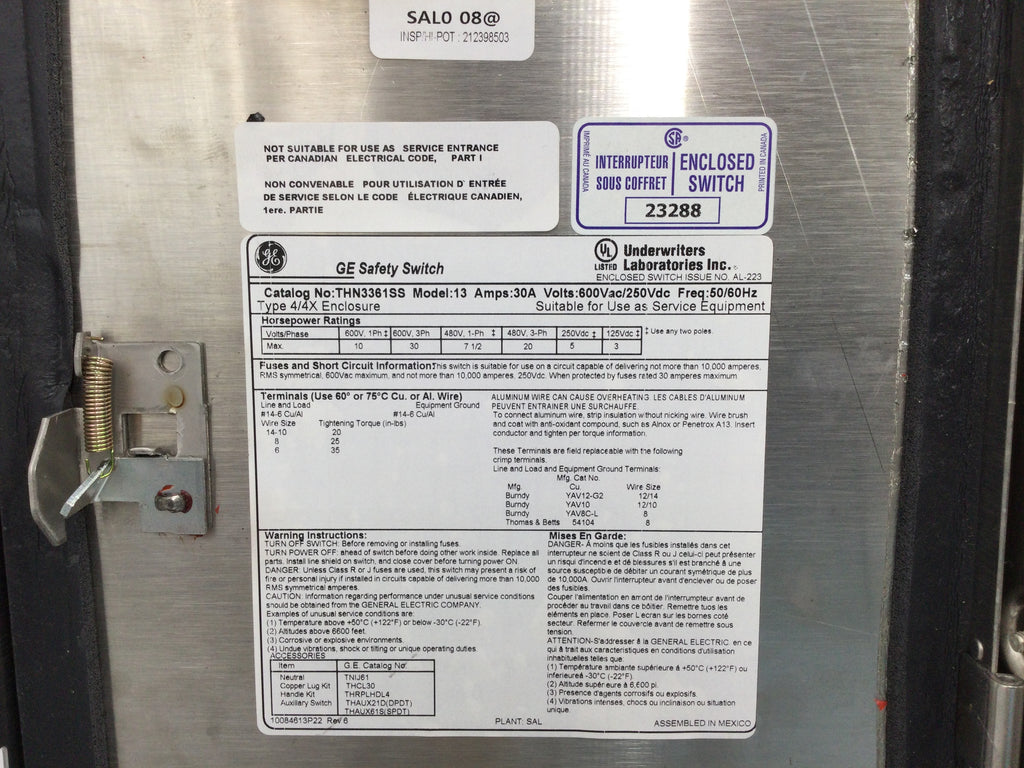 GE General Electric THN3361SS 30 Amp 3 Pole 600vac, 250VDC Stainless Steel Safety Switch