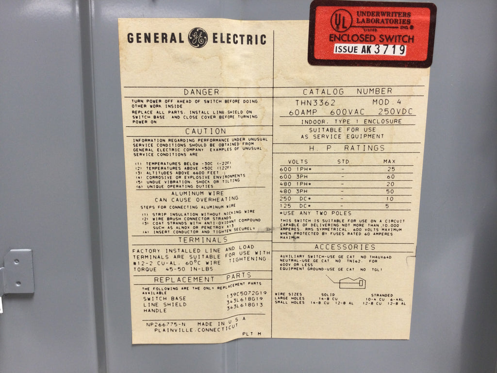 GE General Electric THN3362 60 Amp 600Vac 3 Pole Non Fused Nema 1 Safety Switch MOD 4