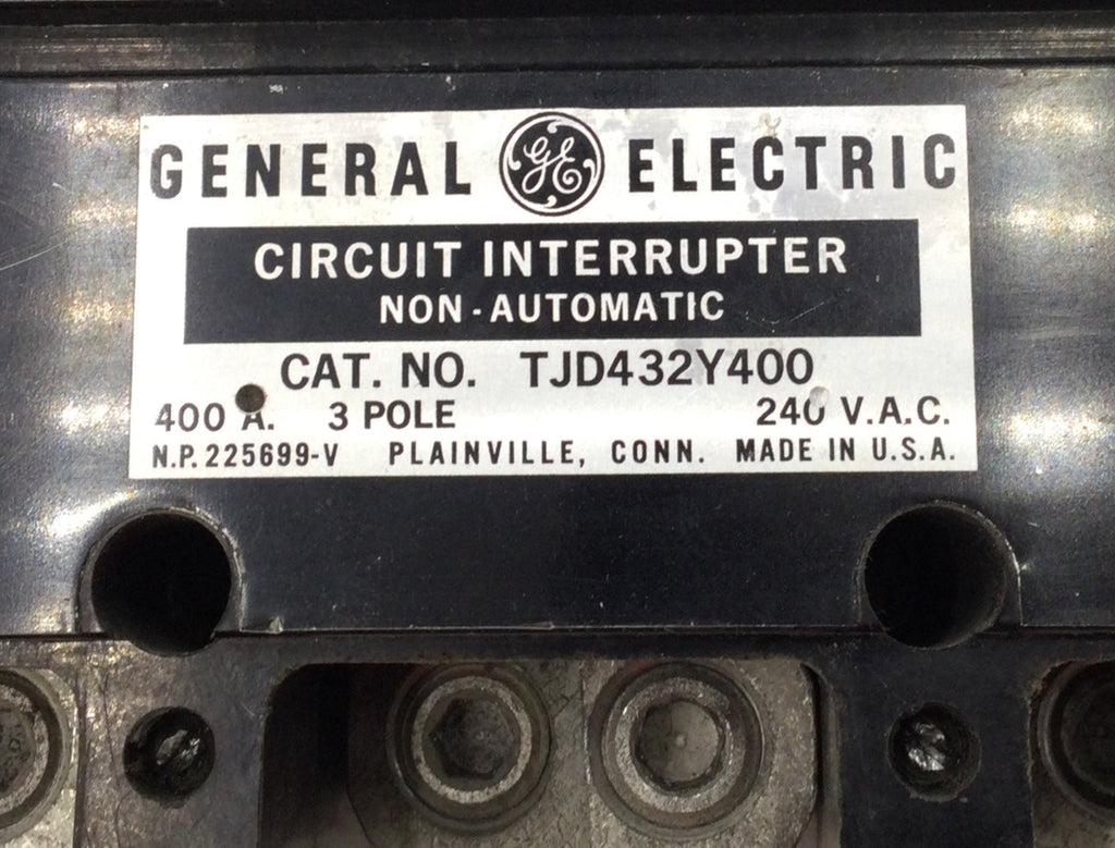 The General Electric TJD432Y400 is a 400 Amp, 3 pole circuit breaker rated for 240V applications. Designed for reliable overload and short circuit protection, it ensures safety and performance in commercial and industrial electrical systems. This unit has cosmetic flaws that do not impact its functionality or electrical integrity.