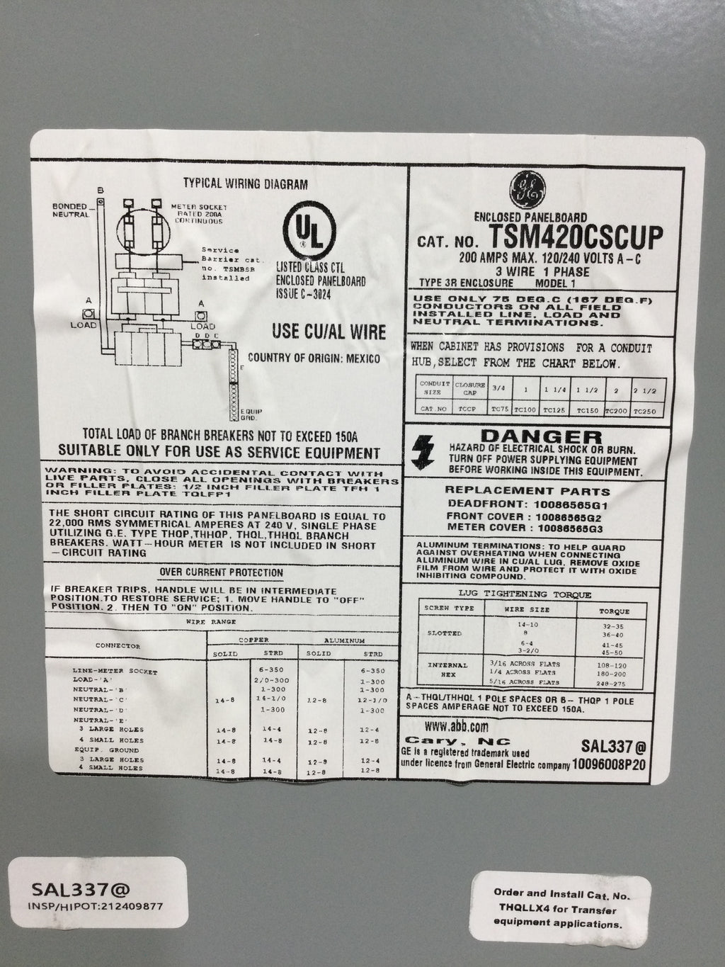 • Single phase, 3-wire, 120/240 VAC, 200 Amp and 22K AIC rating