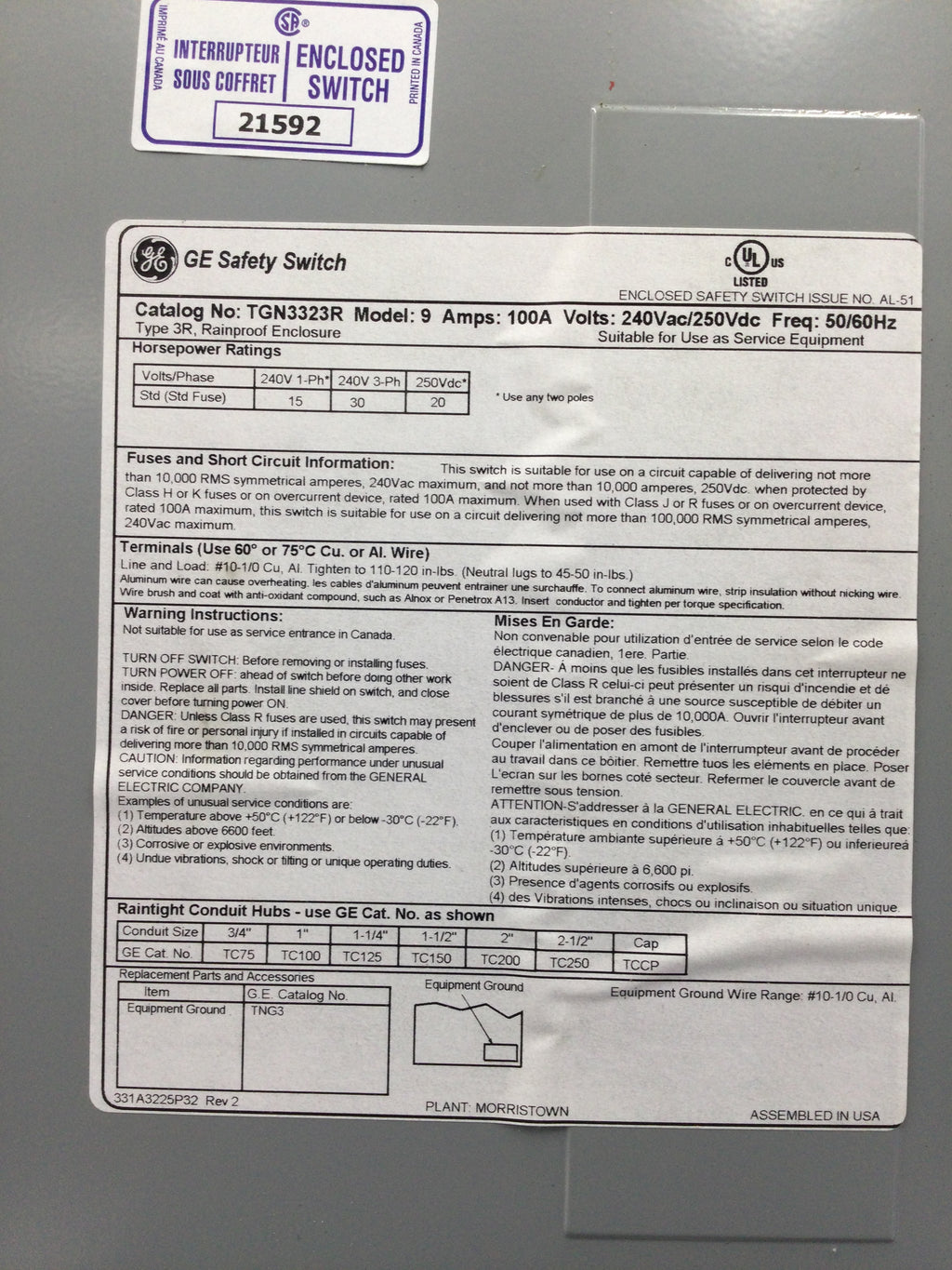 GE/General Electric TGN3323R 100 Amp 3-Pole 240V Safety Switch