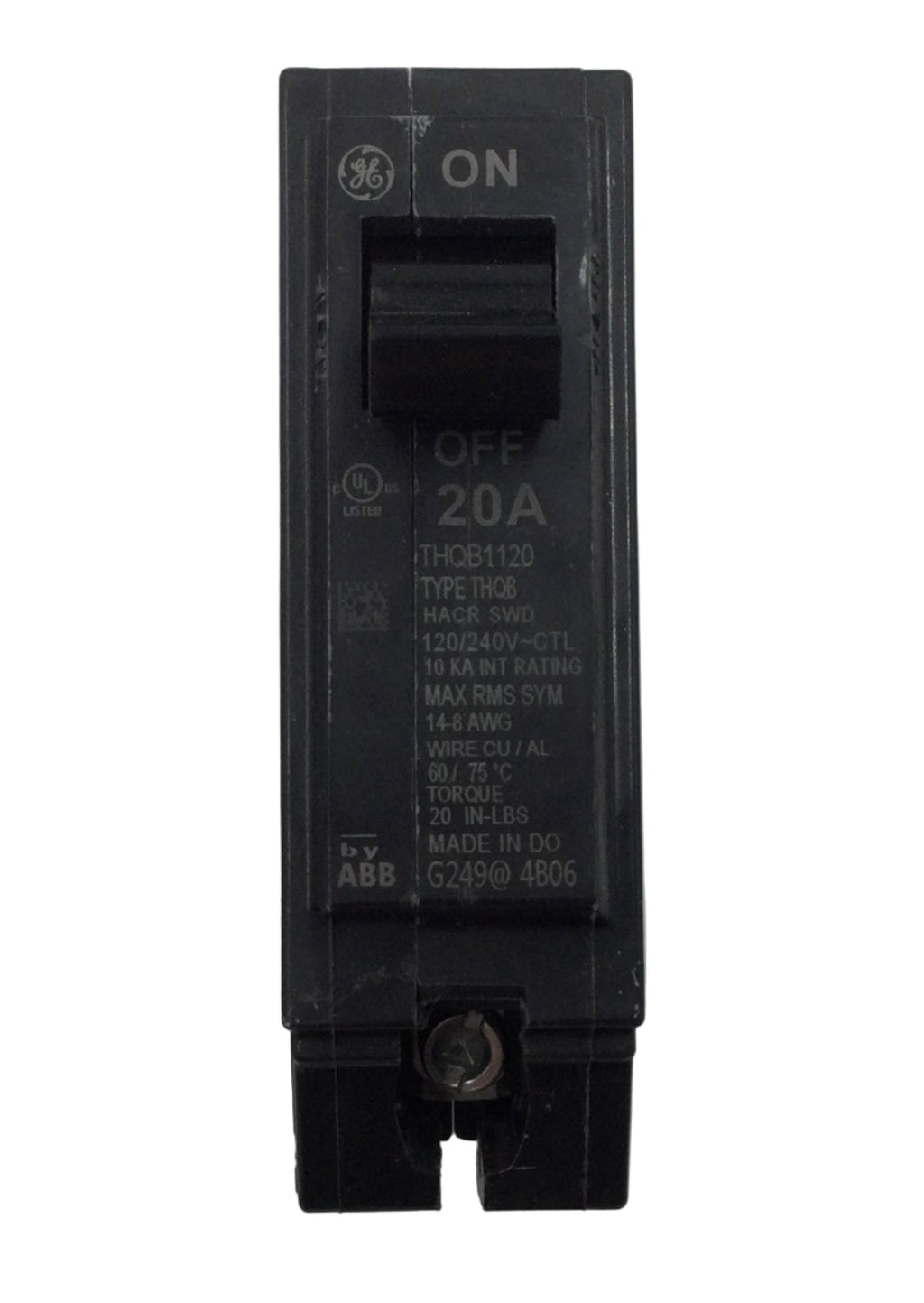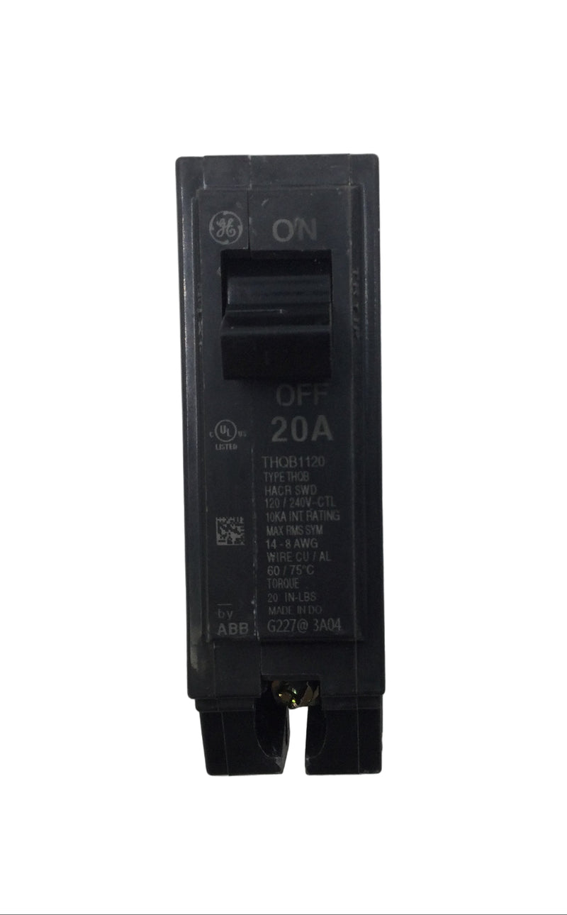 General Electric TQB/THQB1120 20 Amp single pole circuit breaker rated for 120/240V applications. Features a printed face for clear identification and labeling. This breaker provides reliable overcurrent protection in residential and light commercial electrical systems. Compatible with standard breaker panels. UL listed and meets industry safety standards for dependable performance.