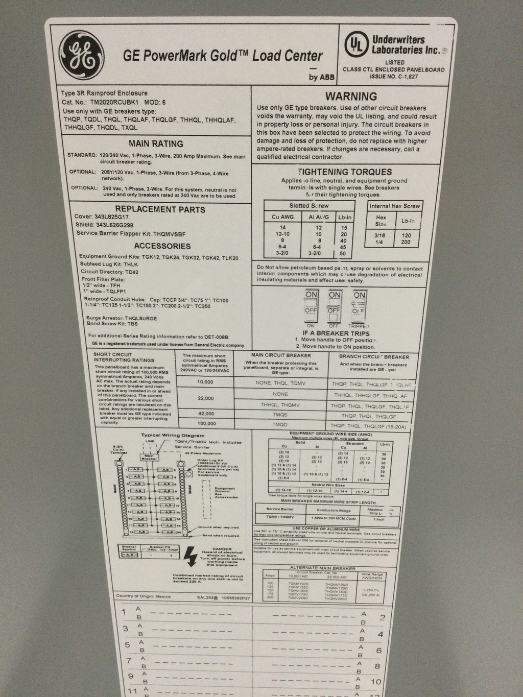 • Type: Nema 3R Enclosure / Power Mark Gold Series / Main Breaker Load Center