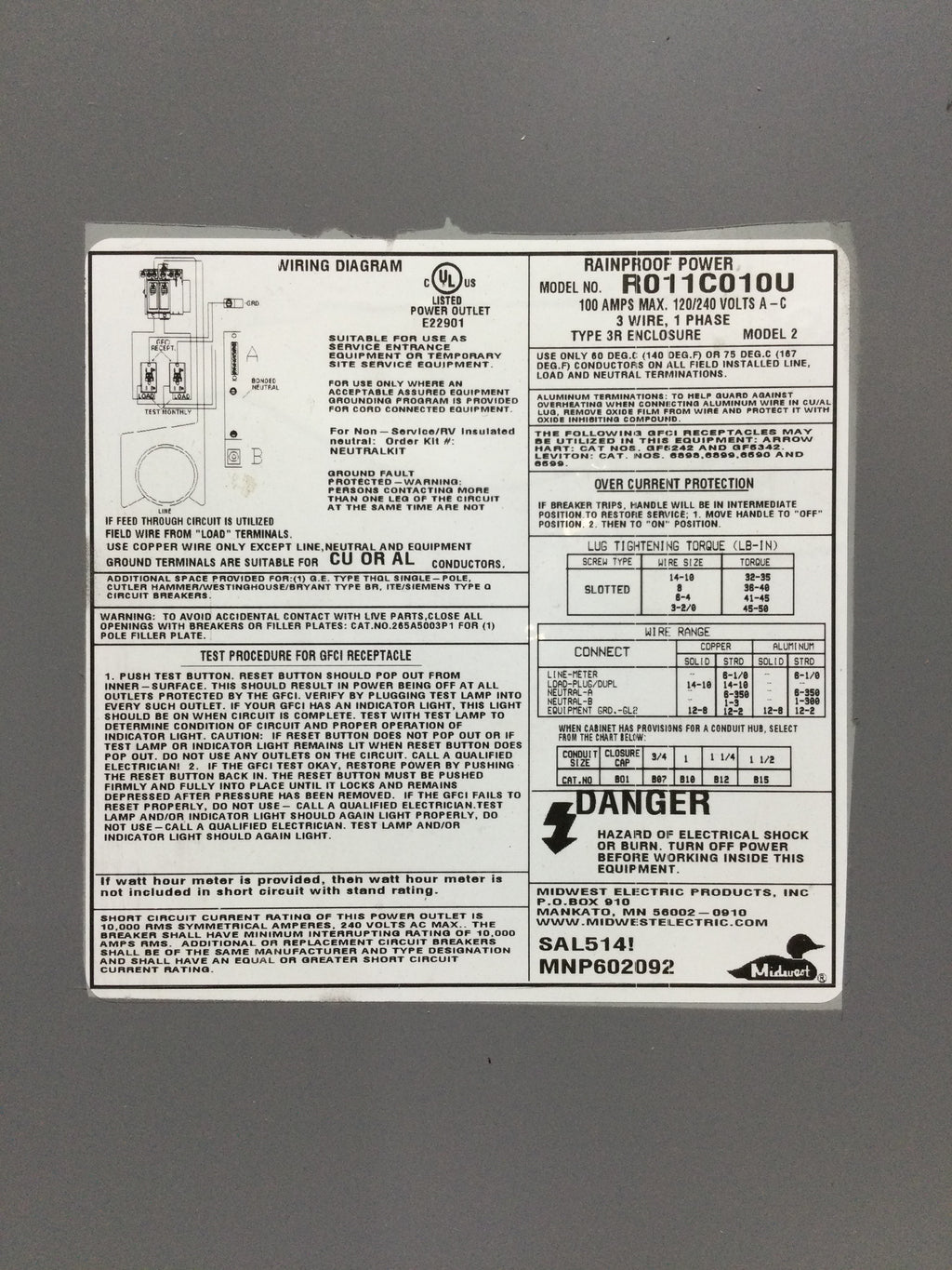 Milbank R011C010U Meter Cover/Door Only 100 Amp 120/240V Nema 3R 17 1/4" x 9 1/4"