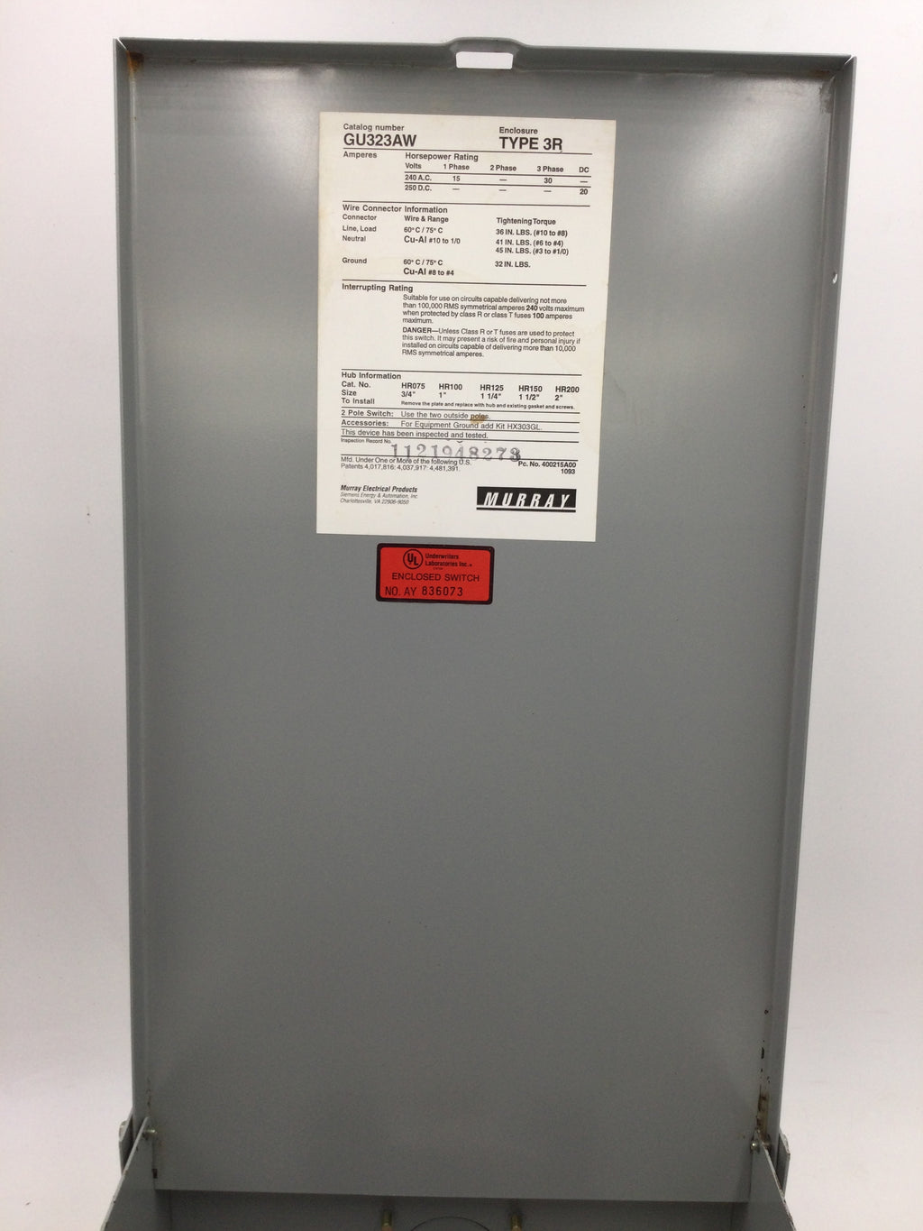 The Murray GU323RW 100 Amp 3 Pole Non Fused General Duty Type 3R Safety Switch is designed to provide heavy-duty protection in commercial, industrial and residential applications. This UL listed switch offers 100 Amps and 240V of power in three-phase, three-wire circuits. Its robust construction ensures superior durability and reliable performance.