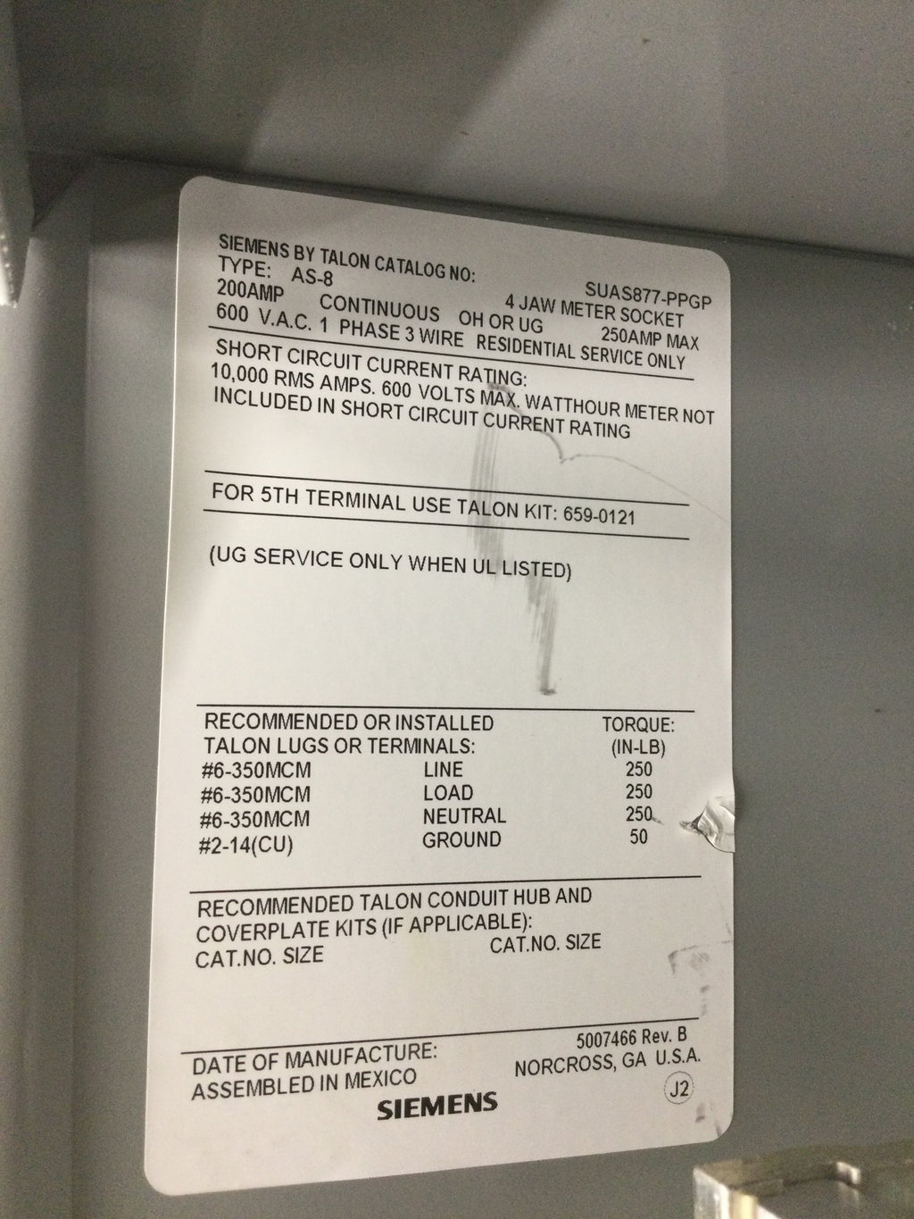 Siemens SUAS877-PPGP; 200 Amp, 1 Phase, 3 Wire Ringless Type Meter Socket Continuous Duty Nema-3r