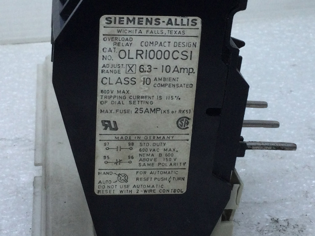 Siemens-Allis OLRI000CSI 6.3-10A 600V Max Overload Relay