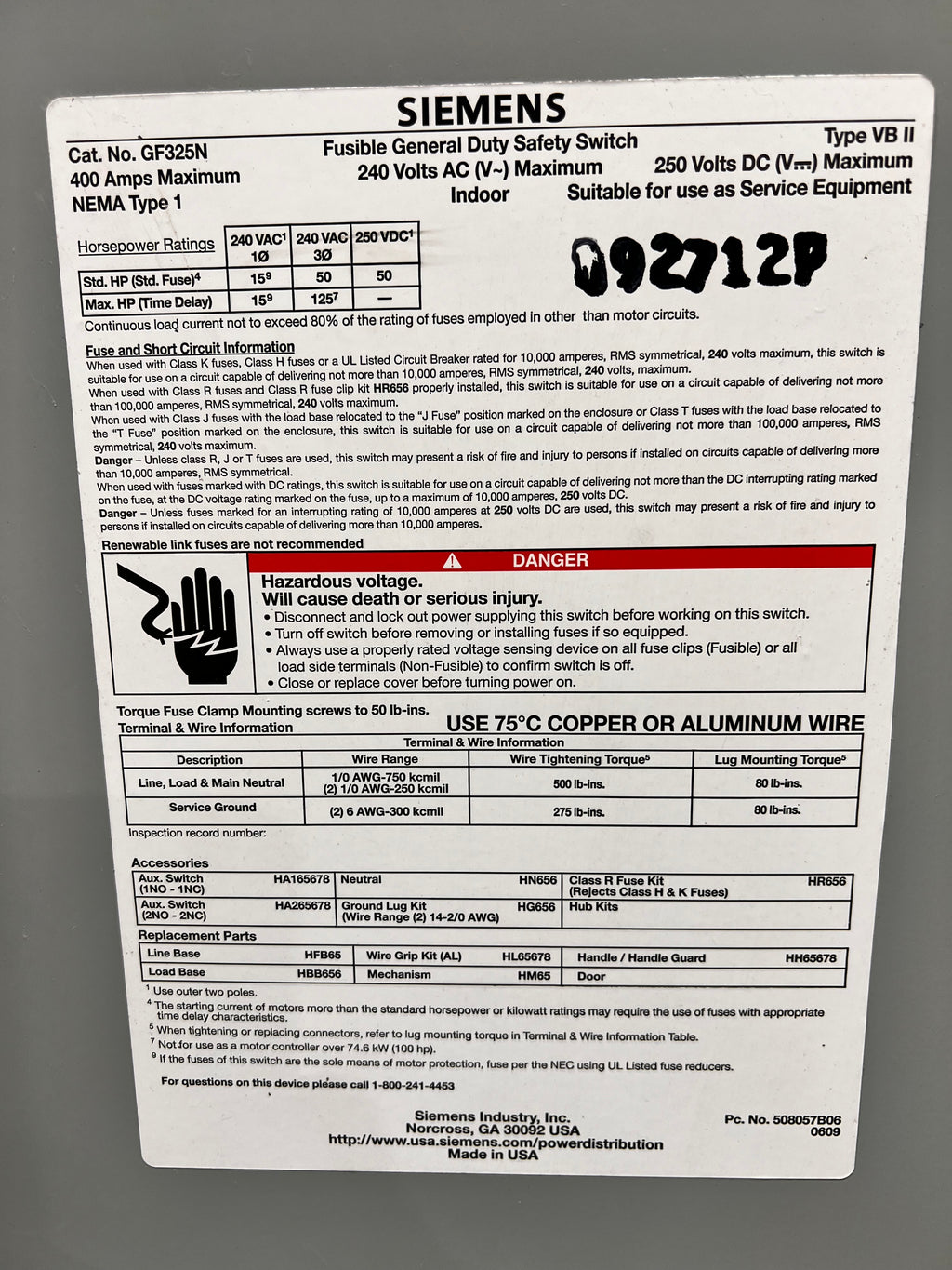 Siemens Fusible General Duty Safety Switch GF325N 400 Amp Nema 1 Type VBII 240v