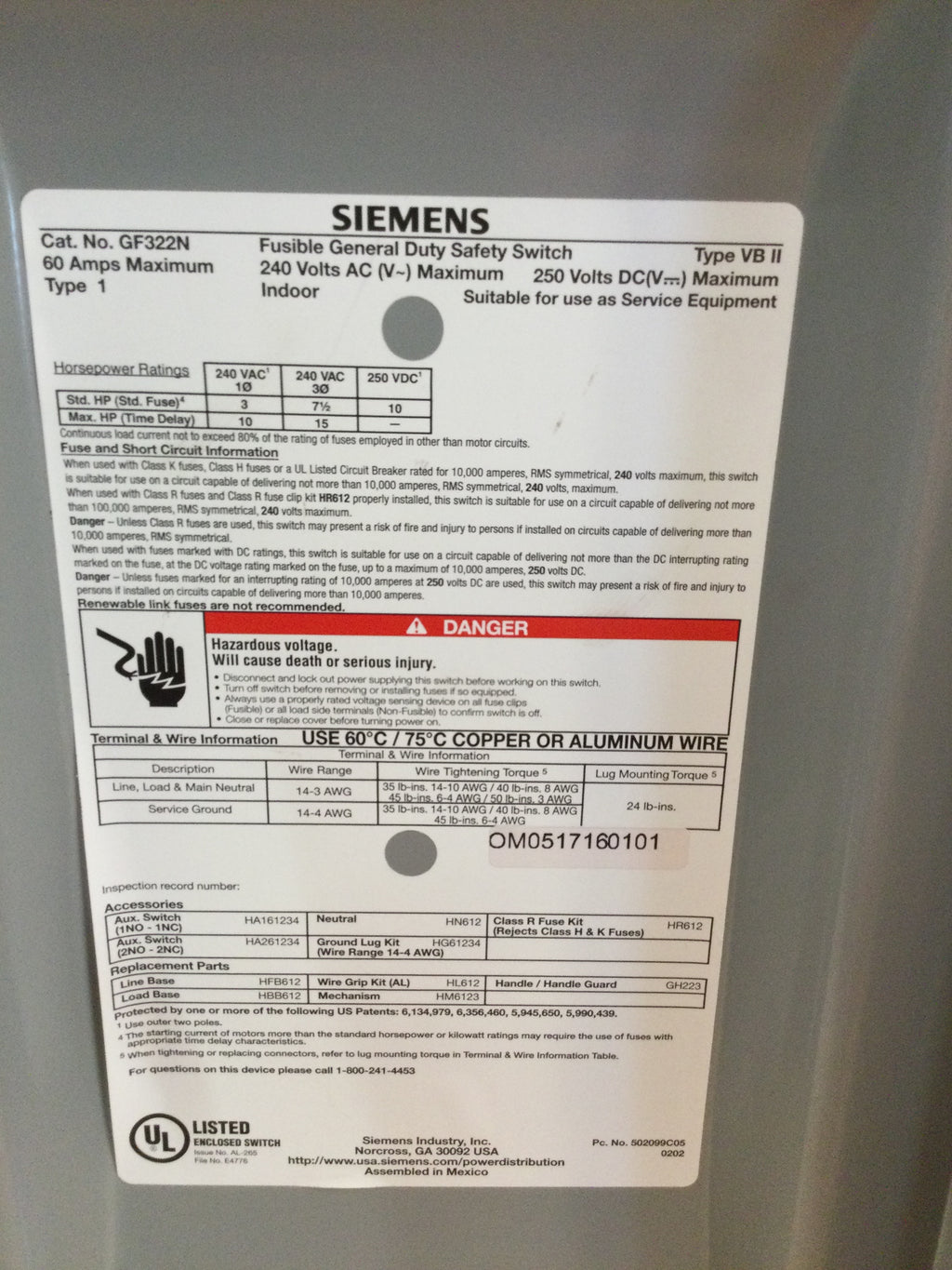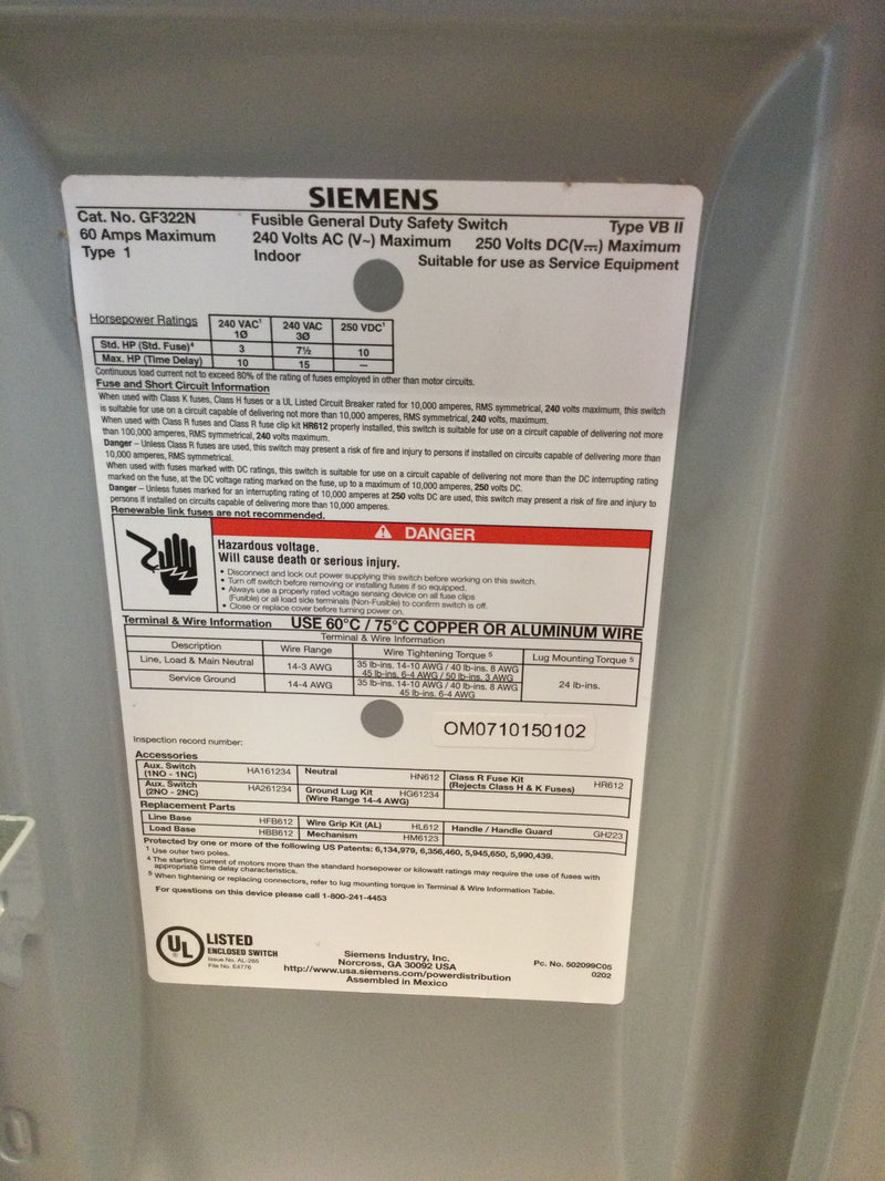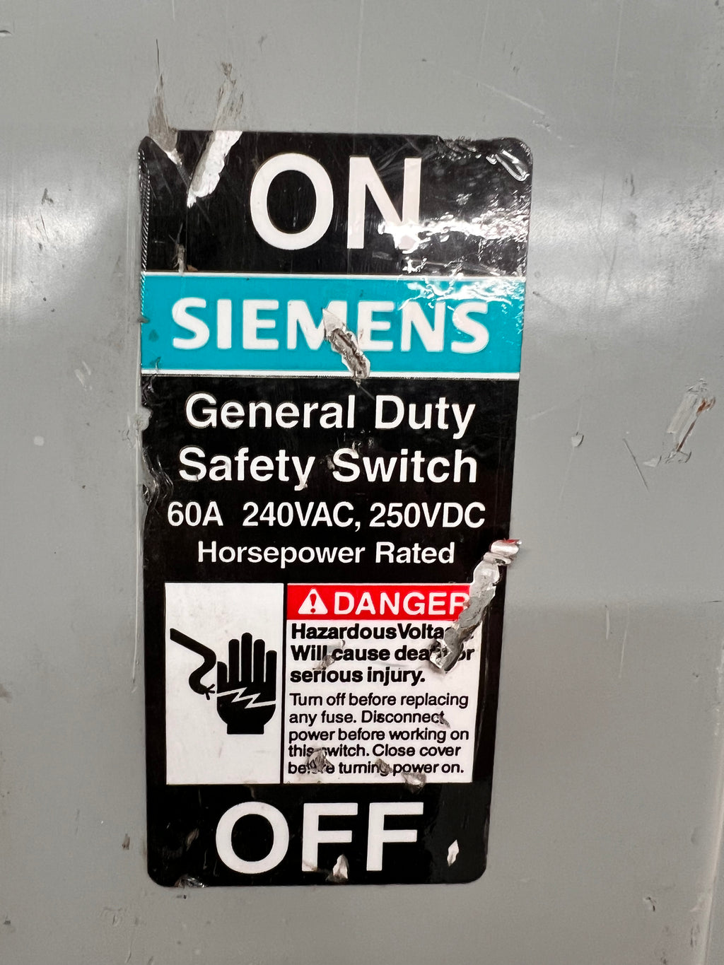 Siemens GF322N 60 amp 3 Pole 240V Type 1 Fusible General Duty Safety Switch