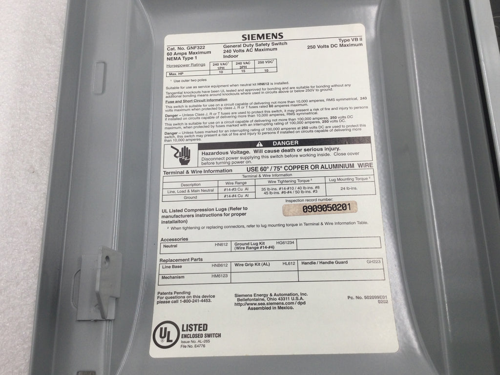 Siemens GNF322 60 Amp 3 Pole 120/240V Non-Fused Safety Switch 12 3/8" x 8 3/4"