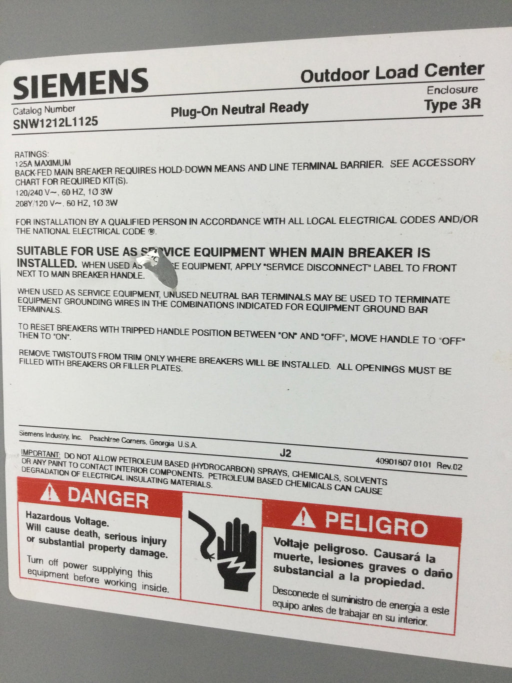 Siemens SNW1212L125 125Amp Nema 3R Outdoor MLO Load Center 12 Space/ 12 Circuit