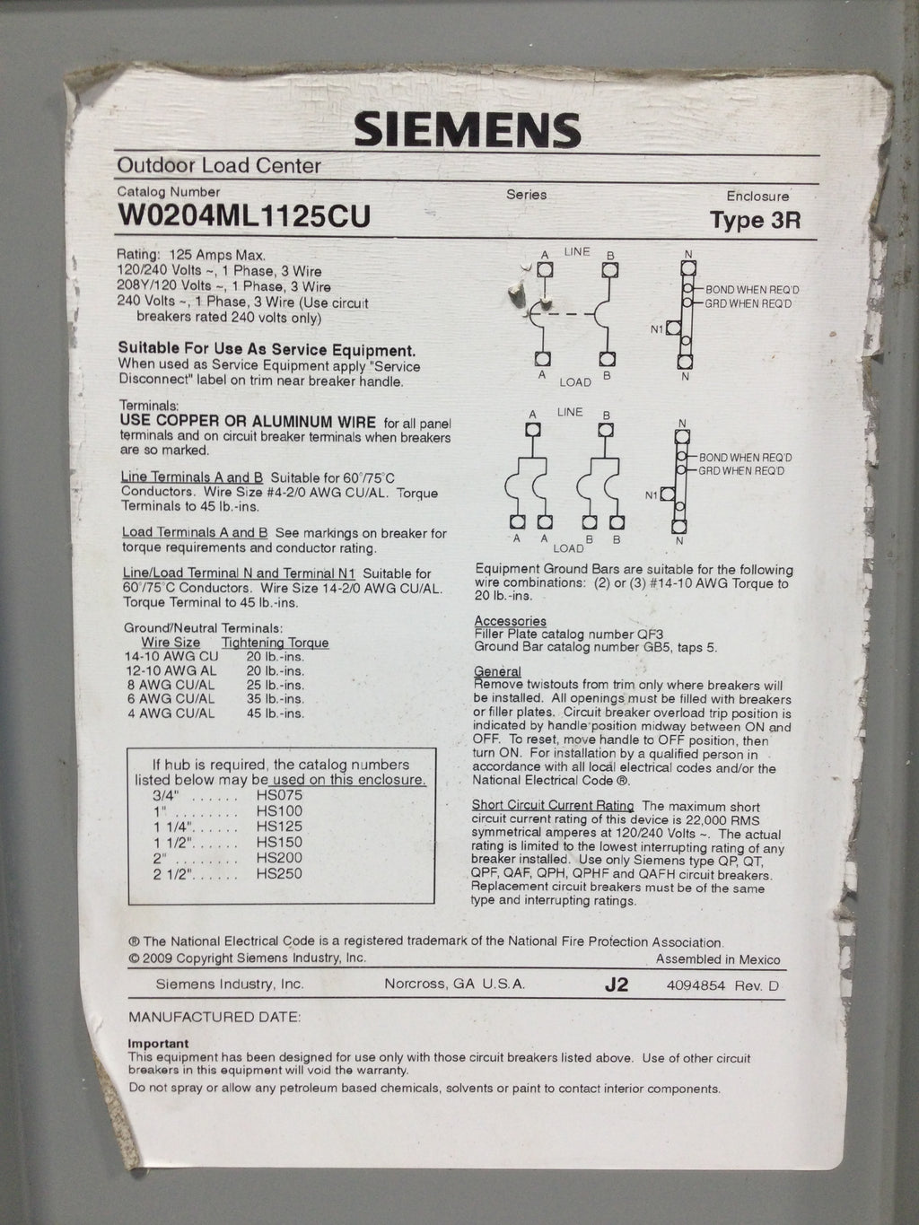Siemens W0204ML1125CU 125 Amp 2 Space 120/240V Panel Cover 17" x 7 1/4"