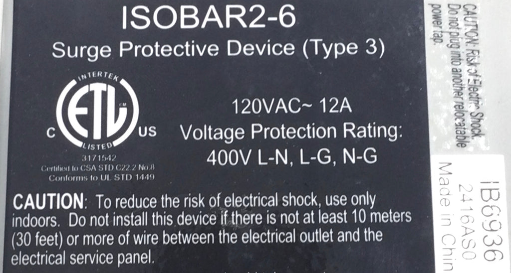 Tripp-Lite ISOBAR2-6 12 Amp 2 Outlet 120 VAC 400V Type 3 Surge Protection Device