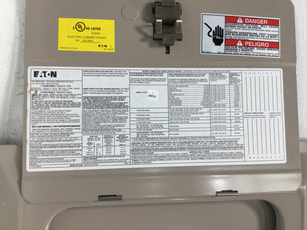 Replacement door and cover assembly for Eaton CH8BS load centers. Fits 125 Amp, 16-space units with dimensions of 16 3/4" x 14 1/4". Maintains proper enclosure protection and compliance with electrical codes.