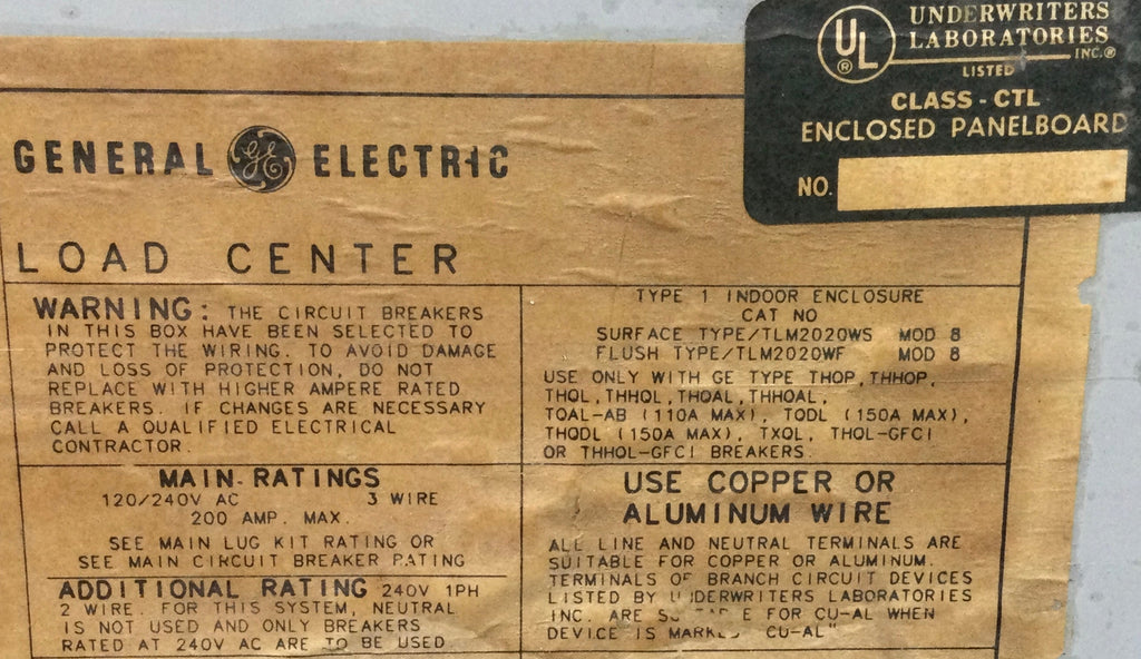 General Electric TLM2020WS/F replacement panel door designed for 200 amp, 40-space electrical panels operating at 120/240V. Measures 31 3/4" x 15 3/8" to fit standard GE panel frames. This unit is missing the latch mechanism, making it suitable for repair applications or as a replacement component. Verify compatibility with your existing panel configuration before installation.