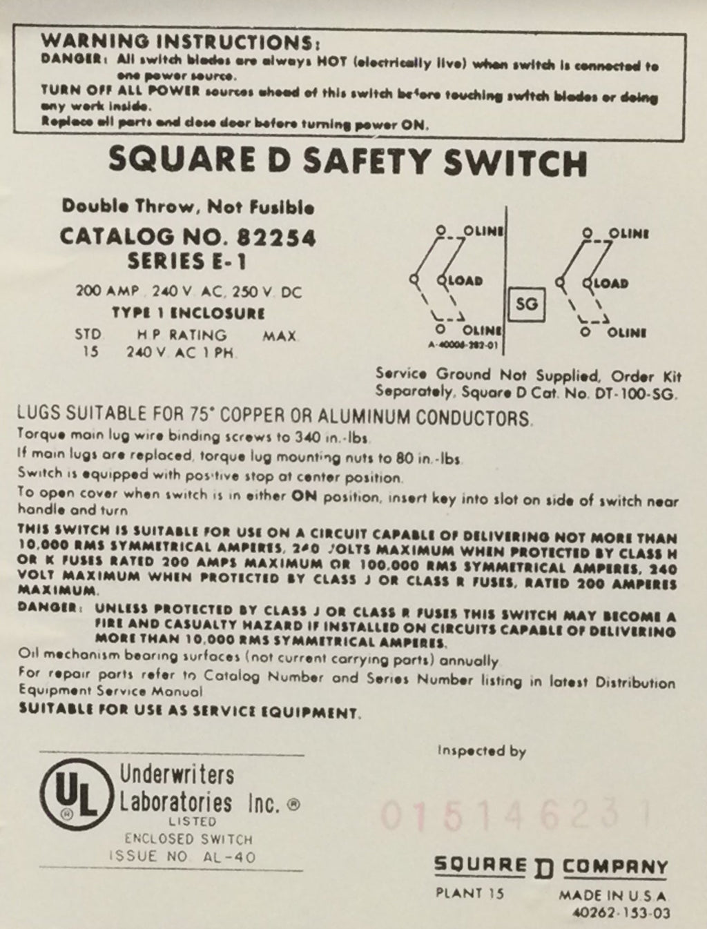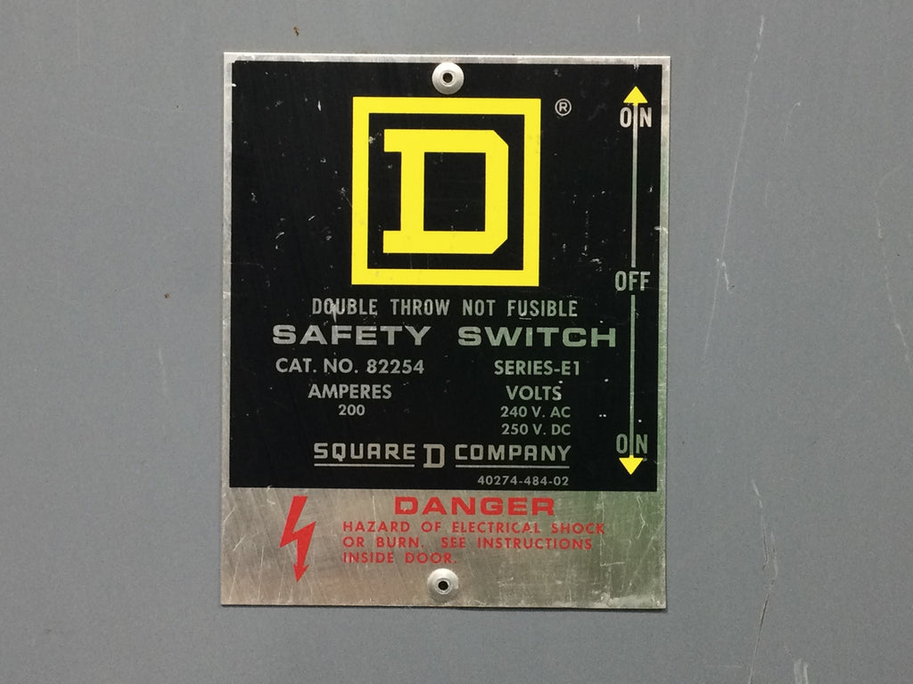 Square D 82254 200 Amp 2 Pole 240V Double Throw Non-Fused Safety Switch